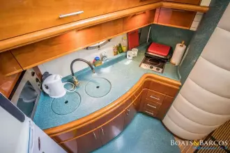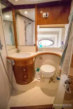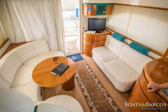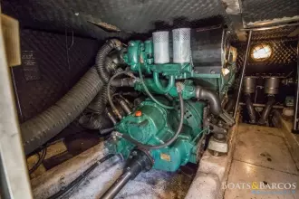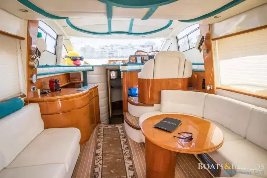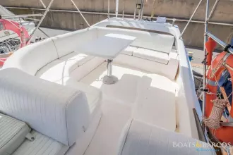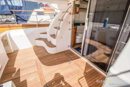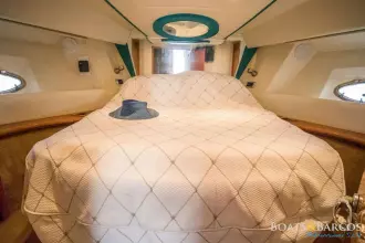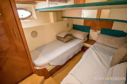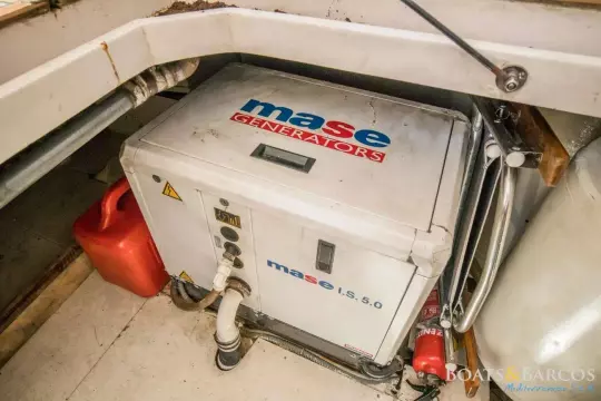 Additional Equipment & Features include a Mase I.S.5.0 Generator, upgraded Raymarine plotters, Air conditioning throughout saloon and cabins, teak decking with recent treatment in cockpit and swim platform, Two cabins (master and twin) plus convertible saloon that will sleep 4–6 and two bathrooms with marine toilets and showers