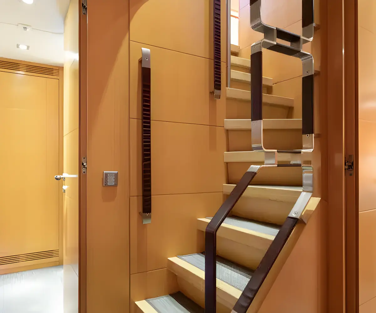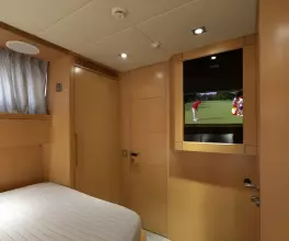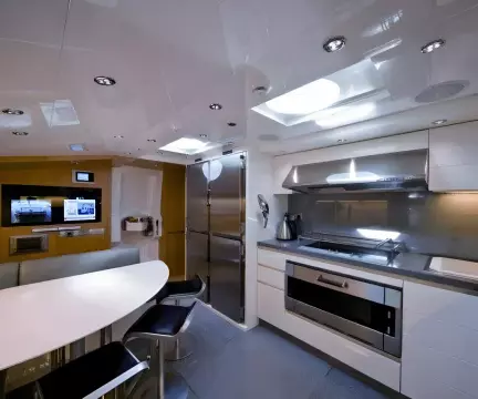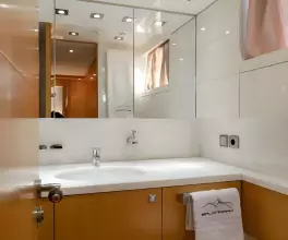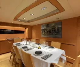 Spacious interior layout offering 4 guest cabins with en-suite bathrooms and 3 crew cabins. Equipped with full air conditioning (180,000 BTU), heating, hot water, and premium Gaggenau galley appliances - Aluminox stainless steel galley fridges - HACCP SYSTEM. The vessel provides excellent comfort for up to 16 guests.