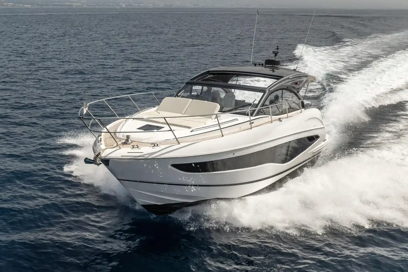 2023 Build, 2023 Model • Twin Volvo IPS 650 (2 x 480 mhp) diesel engines with joystick control • Two cabins plus lower dinette table conversion to double berth, accommodating six guests • Teak side decks • Allure Pack • Dockmate twist IPS • White hull • Whisper Piccolo 12kW generator • Seakeeper 6 Gyro Stabiliser • Bow thruster • Garmin navigation equipment • Reverse cycle air-conditioning/heating • Underwater transom lights • Electrohydraulic passerelle • Watermaker • Premium audio system • LED TVs • Wi-Fi • Electric BBQ • Microwave Oven • Williams 325 Turbo Jet tender for sale by separate negotiation
