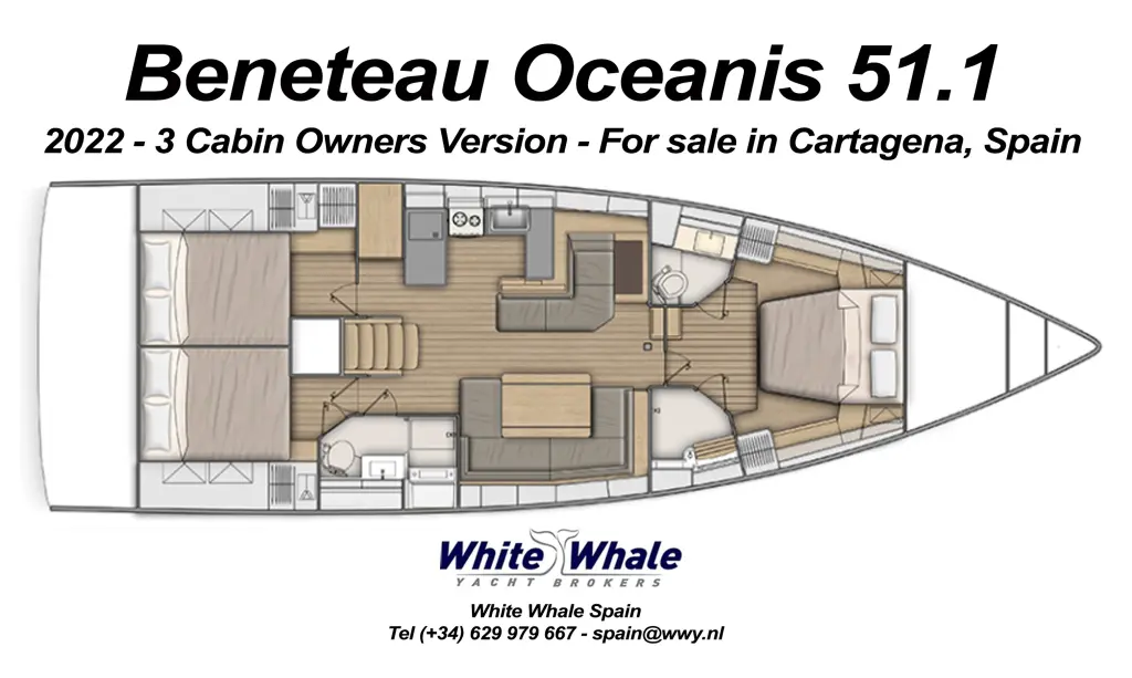 Fantastic “almost new” Beneteau Oceanis 51.1 (built 2022) in turnkey condition, ready for worldwide bluewater cruising. Located in Cartagena, Spain. One private owner, never chartered. Lots of extras: in-boom furling mainsail (2024), staysail (2024), furling Code 0, electric Harken winches, watermaker, A/C, generator, washing/drying machine, 2 fridges, dinghy/outboard, etc. Excellent maintenance, all really well cared for. Owner used this yacht only 1 month/year cruising the Balearics since he purchased in 2022, Yanmar 110Hp engine with only 563 working hours (Sept 2025). Worldwide famous yachtbuilder Beneteau France stands for highest standards on design, construction quality and cruising performance. This Oceanis 51.1 is extremely easy to handle by short-handed crews. Spanish flagged with VAT and spanish taxes paid, valid in all EU countries. For all info and viewings contact Frans Bennekers of White Whale Spain Yacht Brokers on tel +34 629 979 667, email spain@wwy.nl.