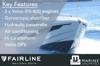 ’Award-Winning’ design worthy of its success, the Fairline Targa 45 Open is a beautiful craft with impressive interior layout & cabin height! Sliding canvas roof maximising the adjustable cockpit space, intuitive controls on the water & with a top-end specification including Seakeeper NG3 Gyroscopic stabilizer, Volvo DPS, reverse cycle air conditioning, Hi-Lo bathing platform, hydraulic passerelle, cockpit wet bar & much more. EU Tax paid! A great option with everything you need, fully serviced and ready to go!