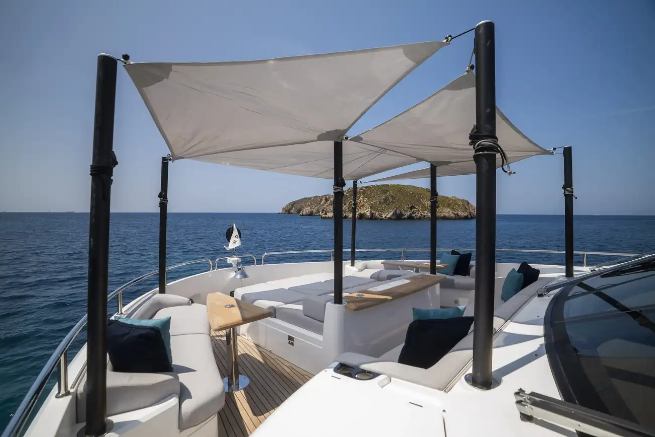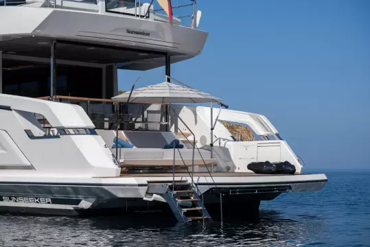 • X-Tend System - the deck locker doors fold down to expose two large sun pads / alternatively, the doors fold up to form an extension of the cockpit, with folding glass railings.