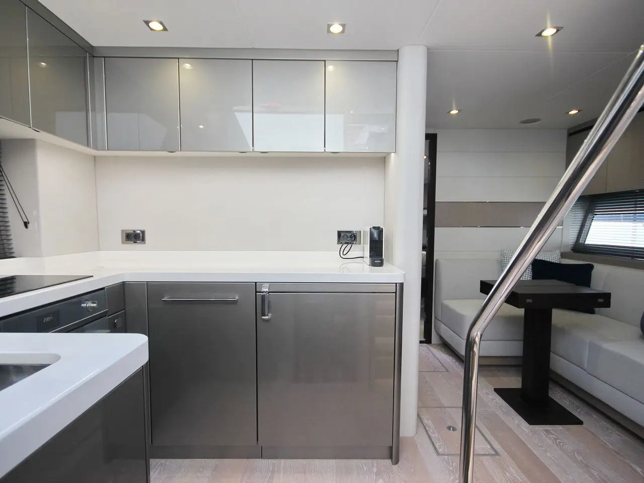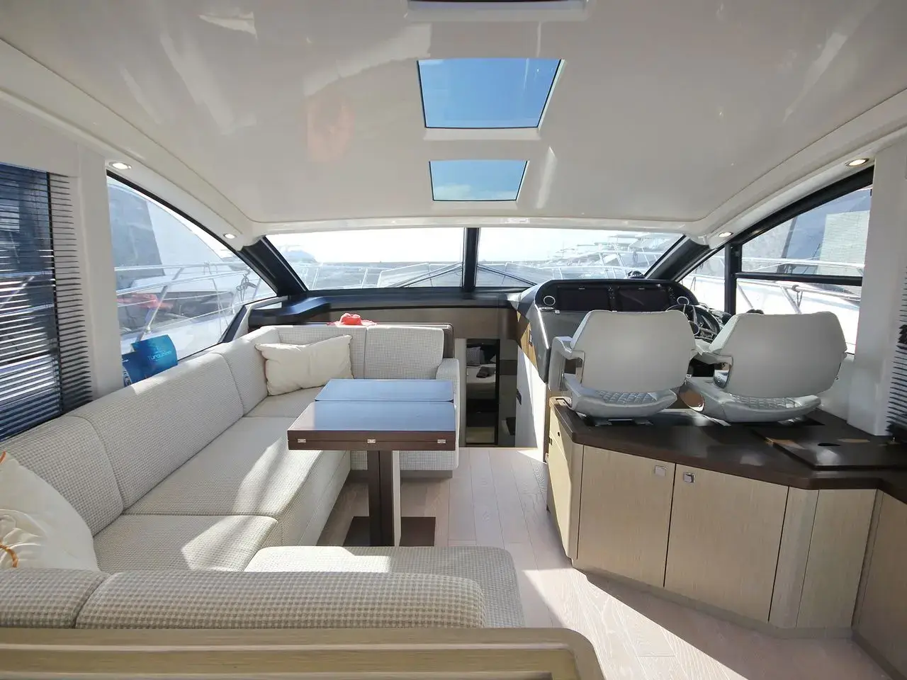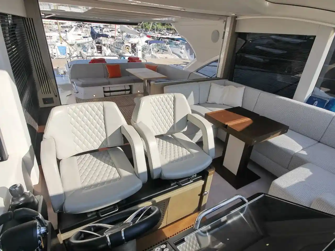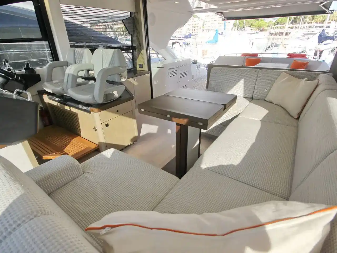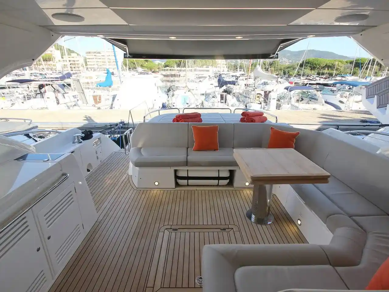 Whether you want to enjoy the sun rays or the shadow and the air-conditioning, there is a place for you. The cockpit wetbar and the interior bar ensure you never run short of cold drinks.
