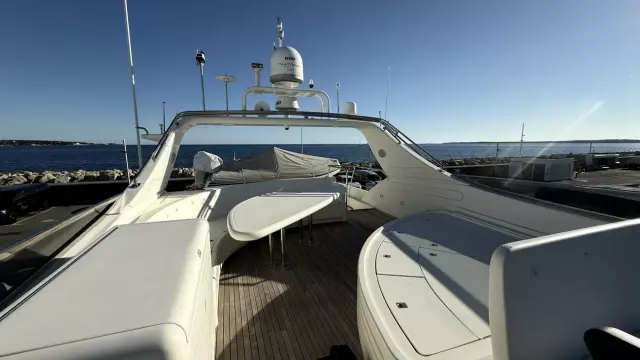 Falcon 86 — The perfect combination of style, comfort, and power. The warm and refined interior combines cherry wood, beige carpet, and navy blue leather seats. Equipped with a recent reversible air conditioning system, warm LED lighting, and the Victron Quattro system, it guarantees the autonomy of all equipment on board. Outside, the spacious flybridge has sun loungers and a convivial dining area, perfect for enjoying the sea and the sun..