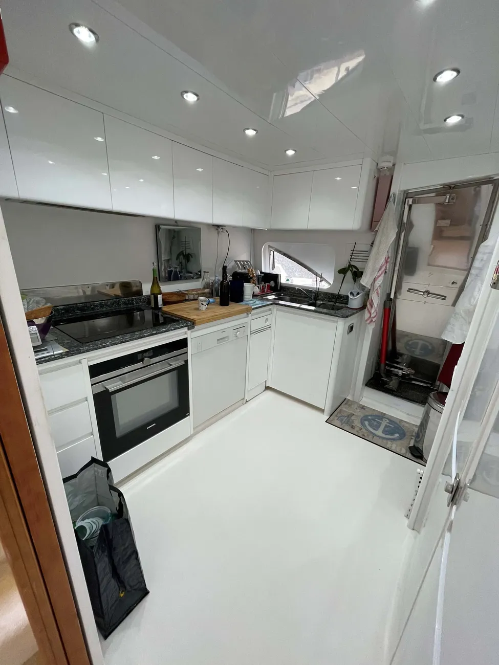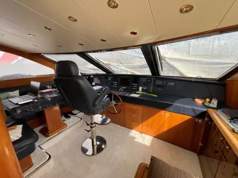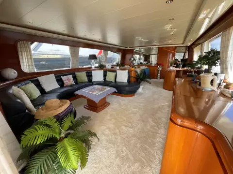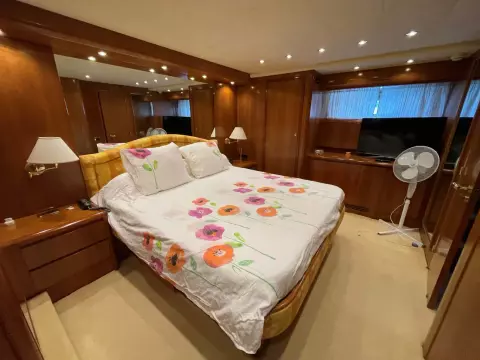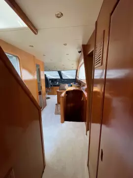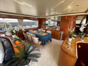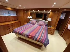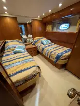 With 4 cabins, it accommodates up to 9 guests in a warm and sophisticated atmosphere, highlighted by satin cherrywood interiors, beige carpet, and navy blue leather upholstery.