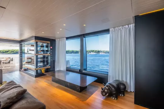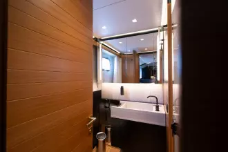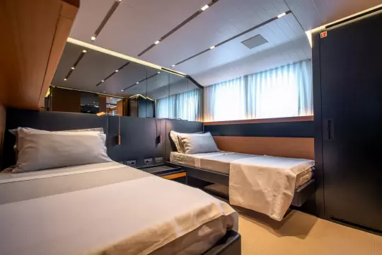 M/Y Le Gypsy offers refined comfort for up to 10 guests across five beautifully appointed cabins. The full-beam master suite is conveniently located on the main deck, providing panoramic views and direct access to the main areas of the yacht. Four additional guest cabins are situated on the lower deck, each designed with elegance and privacy in mind, ensuring a luxurious stay for family and friends. The yacht also accommodates a dedicated crew of five, who are comfortably housed in three well-designed crew cabins. The crew quarters, galley, and pilot house are thoughtfully separated from the guest living spaces, creating a discreet division between service and leisure areas. This smart layout guarantees guests enjoy uninterrupted privacy while benefitting from attentive, seamless service at all times.