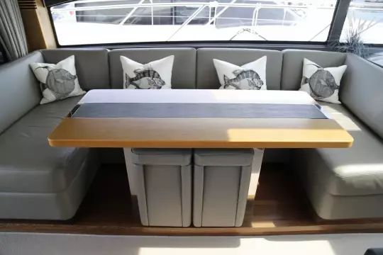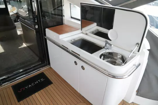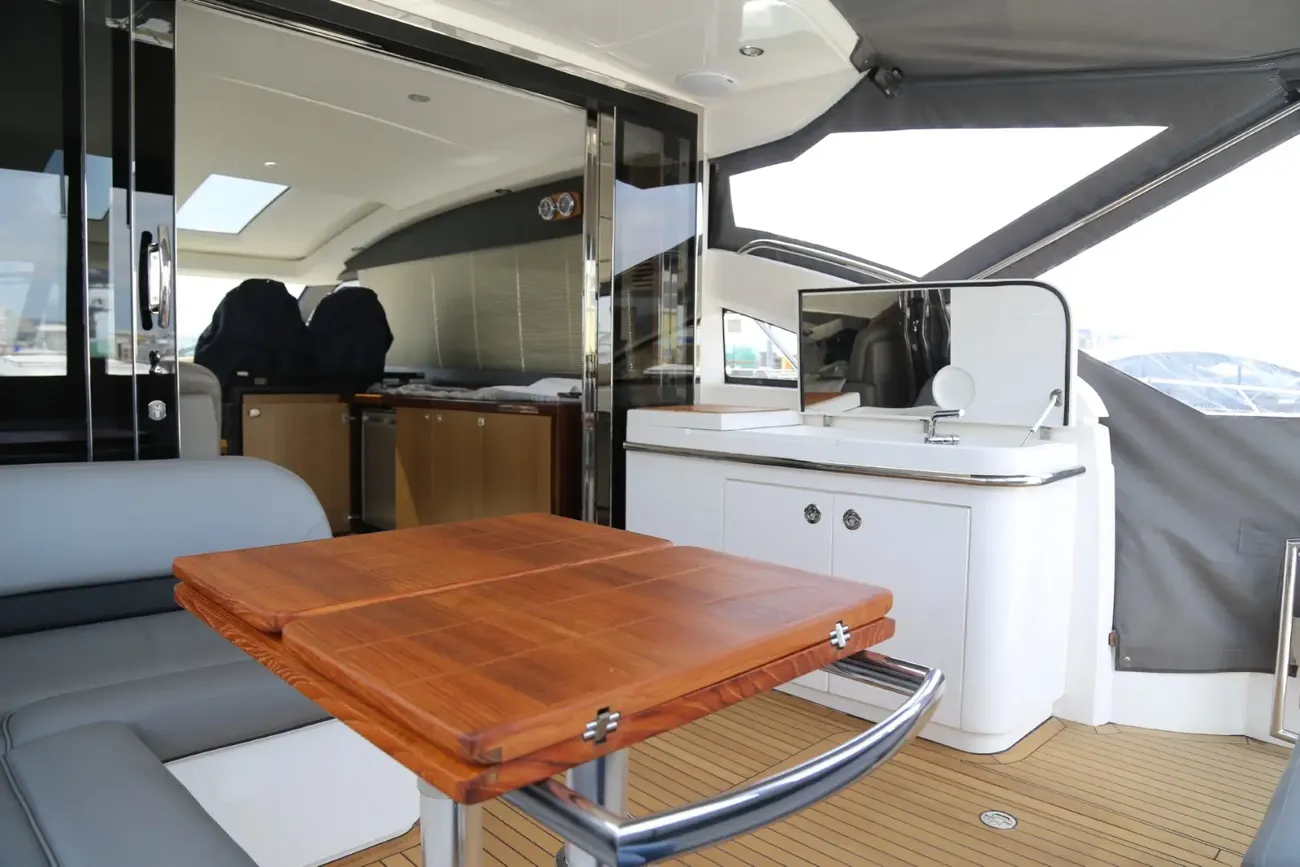 - Spacious Open Cockpit: Ideal for entertaining, complete with U-shaped seating, folding teak table, and a wetbar with griddle, coolbox, and sink.