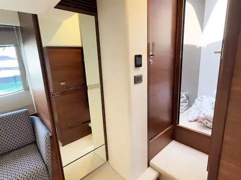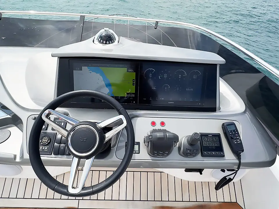 This Princess F45 Motor yacht is fitted with twin Volvo IPS 650 (2 x 480hp each) diesel engines. Bowthruster (120Kgf) with dual station controls. Antifouled IPS drives & propellers. Walnut interior wood satin finish. Galley floor is in V groove planked Walnut with Koko White Galley countertop. Standard lower helm console Anthracite Grey painted finish. Helm seats are upholstered in Quartz III Pewter leather. Flybridge wet bar incorporating sink & electric BBQ. Teak with black caulking on flybridge deck & side decks. Additional 10m anchor chain to give a total 50m. Underwater transom lights (2 Lumishore SMX53 White) Underwater transom lights to aft hull sides (4 Lumishore SMX53 White, 2 per side) On-board WIFI network incorporating external WIFI and 3G/4G antenna for extended range. Fusion Apollo MS-RA770 with AM/FM/Bluetooth /DAB/WiFi External USB paired with 2 Focal speakers Flybridge -Waterproof Fusion speakers linked to saloon sound system (Fusion Apollo ERX-400). Garmin GMR 424 XHD2 digital colour radar with 48" 4Kw scanner. Second Volvo/Garmin 16" colour multifunction display fitted at lower helm position. Garmin (GMI 20 colour) 4" multifunction display at lower helm. Second Volvo/Garmin 16" colour multifunction display at the upper helm. Garmin (GMI 20 colour) 4" multifunction display at the upper helm. International VHF. Garmin AIS Class B transponder. Eberspacher M10 boat heating - includes outlets in both toilet compartments. Windscreen demist system using warm air heater powered from calorifier. Reticulated foam to all standard exterior cockpit, foredeck & flybridge seating/sunpads. Reticulated foam to forward sunbed. Kohler 9kW, 50Hz, 230v Generator. Allure Collection Exterior styling. Teak step nosing upgrade Flybridge console finished in metallic Oyster Grey. Foredeck sunbed cushions with adjustable headrests. Radar arch finished in metallic Graphite Grey, Aft canopy feature chamfer in Electric Blue. Exterior covers - Dark Blue Canvas. Electric barbeque Sink with hot/cold water in transom seat overhang in place of locker. Full Flybridge Cover. Awlgrip dark blue painted hull.