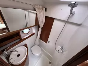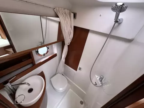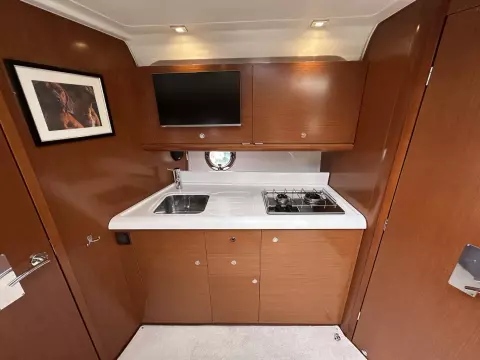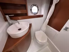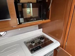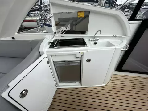 On deck, the cockpit layout is spacious and sociable, enhanced further by the integrated wetbar—ideal for entertaining. Down below, the finish is sleek and modern, with ample natural light and two good-sized cabins offering excellent accommodation!