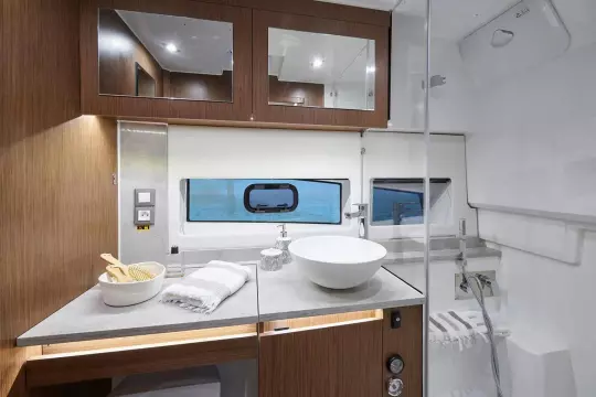 - Separate shower, sink, hull porthole, and window