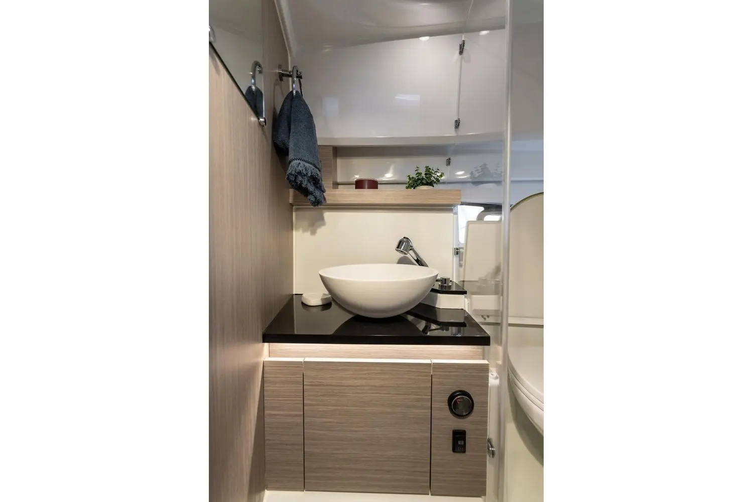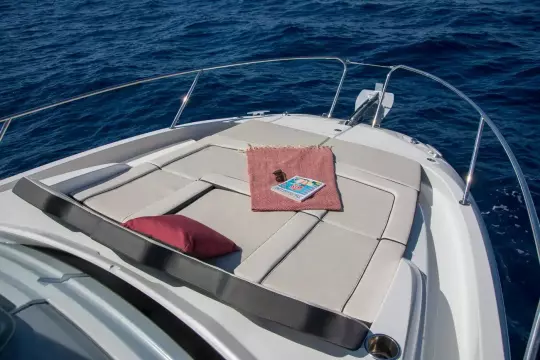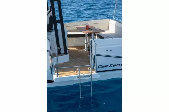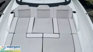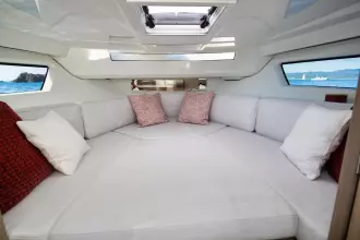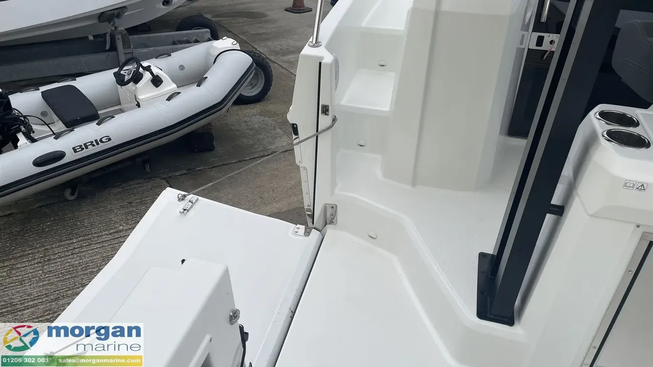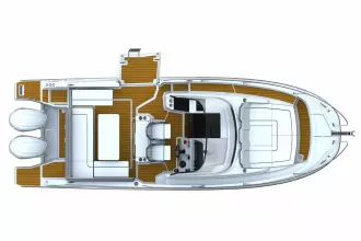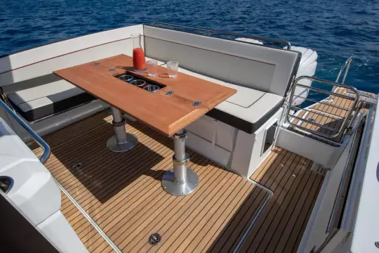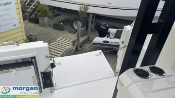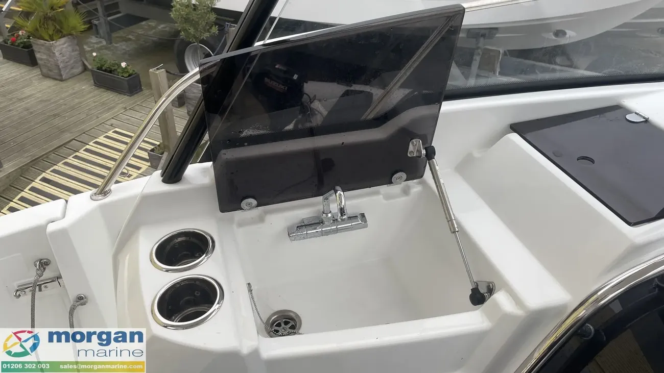 Cockpit: Cockpit galley leaning post with 49L fridge, storage and gas stove. Fibreglass hardtop: T-top with fibreglass roof with black aluminium legs and aft cockpit work light. Adjustable pilot and co-pilot large bolster seats. Helm position with dashboard, full engine controls, compass, and navigation + music electronics. Manual folding terrace with swim ladder for increased cockpit space and easy access to the water. Extended swim platforms + locker. Cockpit shower. Cup holders. Sink in cockpit. Cockpit upholstery - silvertex ice diamante carbon. Removable fibreglass table in cockpit.