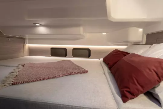 Cabin: Forward cabin with 2x single berths + double berth complement, shelves + storage, cushions, transparent sliding plexi door, opening deck hatch, removable carpet, porthole in console, hull windows with opening portholes. Aft cabin with double berth, shelves, storage and hull windows + porthole. Interior curtains. Toilet compartment with electric fresh water flush toilet, shower compartment, storage and opening porthole. Interior galley with fridge, sink and opening porthole. Upholstery saloon / cabin - pvc marlin pure white. Double berth in saloon.