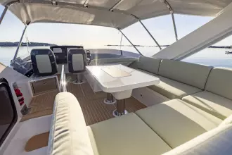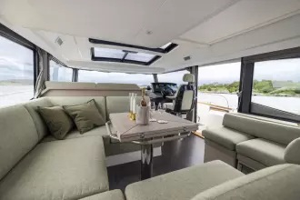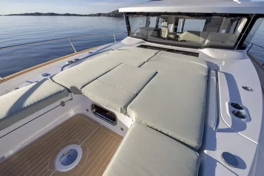 Step inside to a thoughtfully designed interior focused on comfort and quality. Both the master and front cabins feature exclusive coil mattresses, each upgraded with plush mattress toppers for a luxurious night’s sleep. A versatile bunk bed solution adds flexibility for guests or family. The cabin and aft deck cushions are finished in soft Alcantara Dynaskin (201 - beige), while the exterior seating is upholstered in durable Sunbrella Natte fabric (Heather Beige - NAT 10028), offering both elegance and weather resistance. The interior is completed with SmartStrand Romance carpet in Faux Pearl, adding a warm, refined feel underfoot.