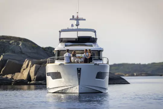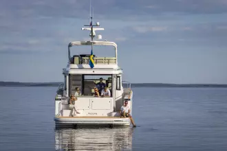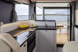 The helm is equipped with twin 12” Volvo Penta Glass Cockpit multifunction displays, delivering an intuitive and comprehensive navigation experience. A third 12” MFD is installed on the flybridge, ensuring full control from both stations. For added convenience and precision, a remote control operates the bow and stern thrusters as well as the windlass, making docking and anchoring smooth and stress-free.