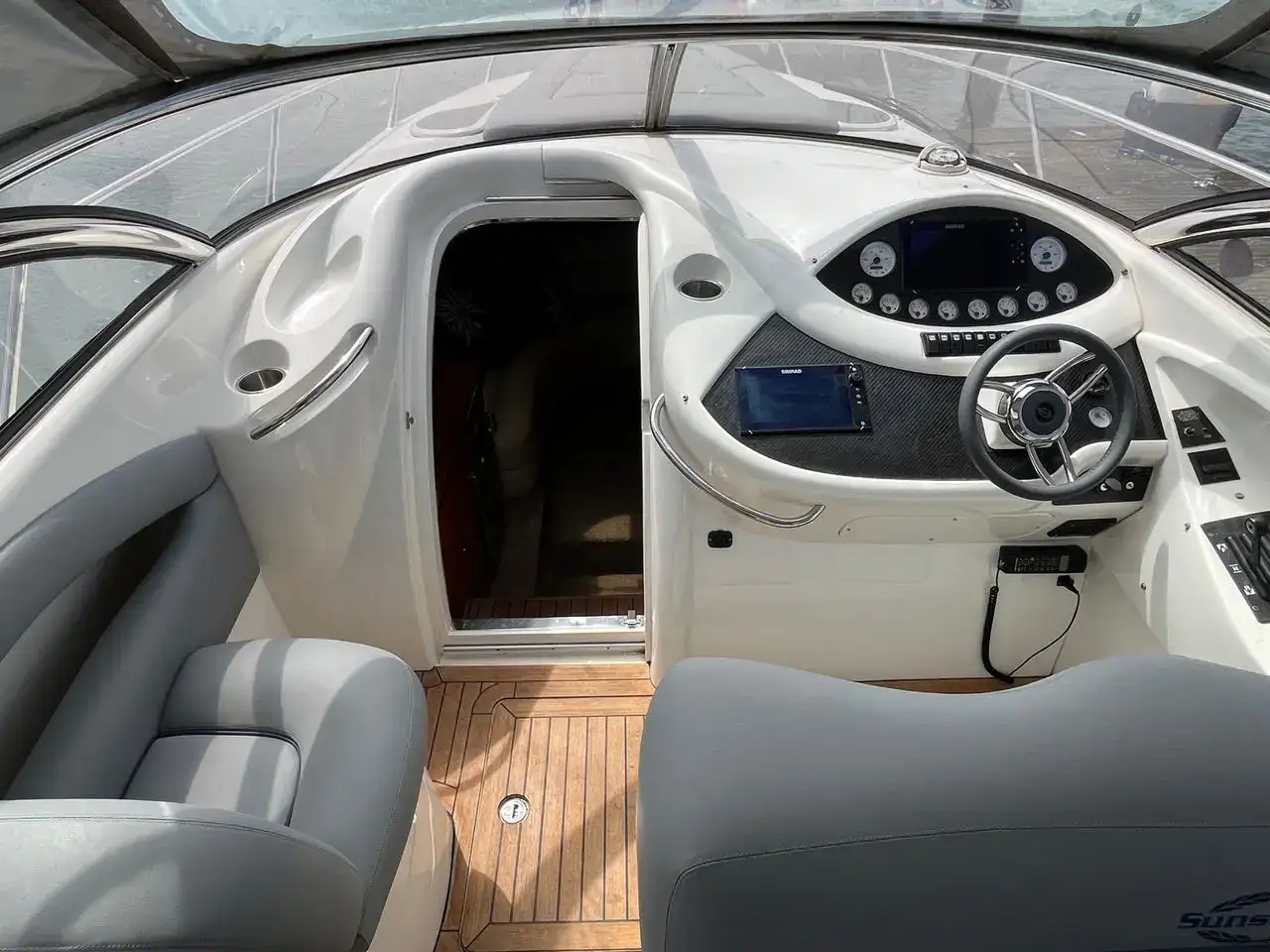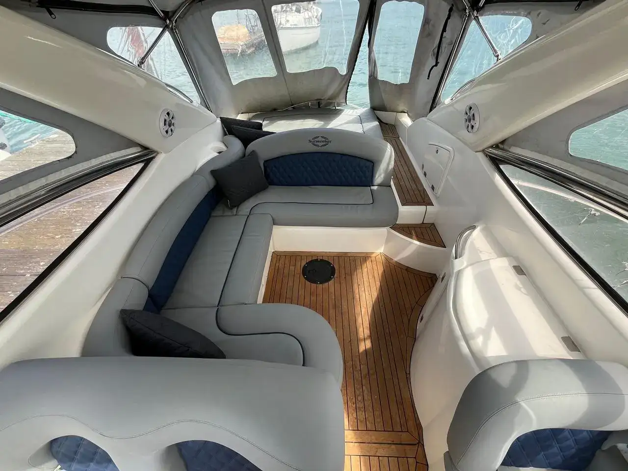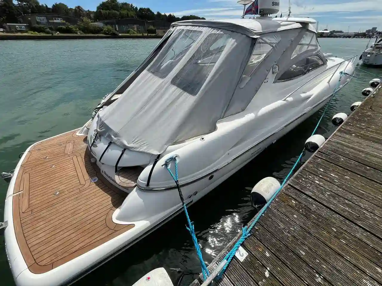This Superhawk 40 is an early version fitted with the twin Yanmar engines, two speed gearboxes and Trimax Surface drives, giving it very punchy, sporty performance which is a real drivers delight. With the accommodation below decks for the occasional overnight or weekend stay for 2, you’re really onto a winning combination of style and practicality combined with the Sunseeker performance experience.