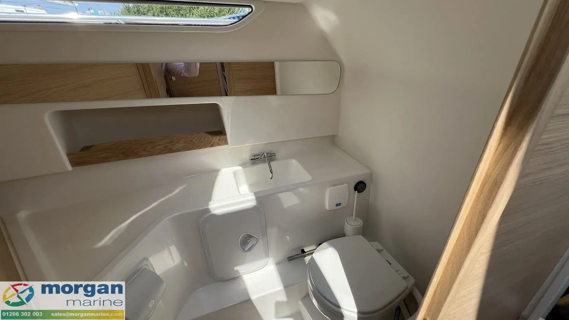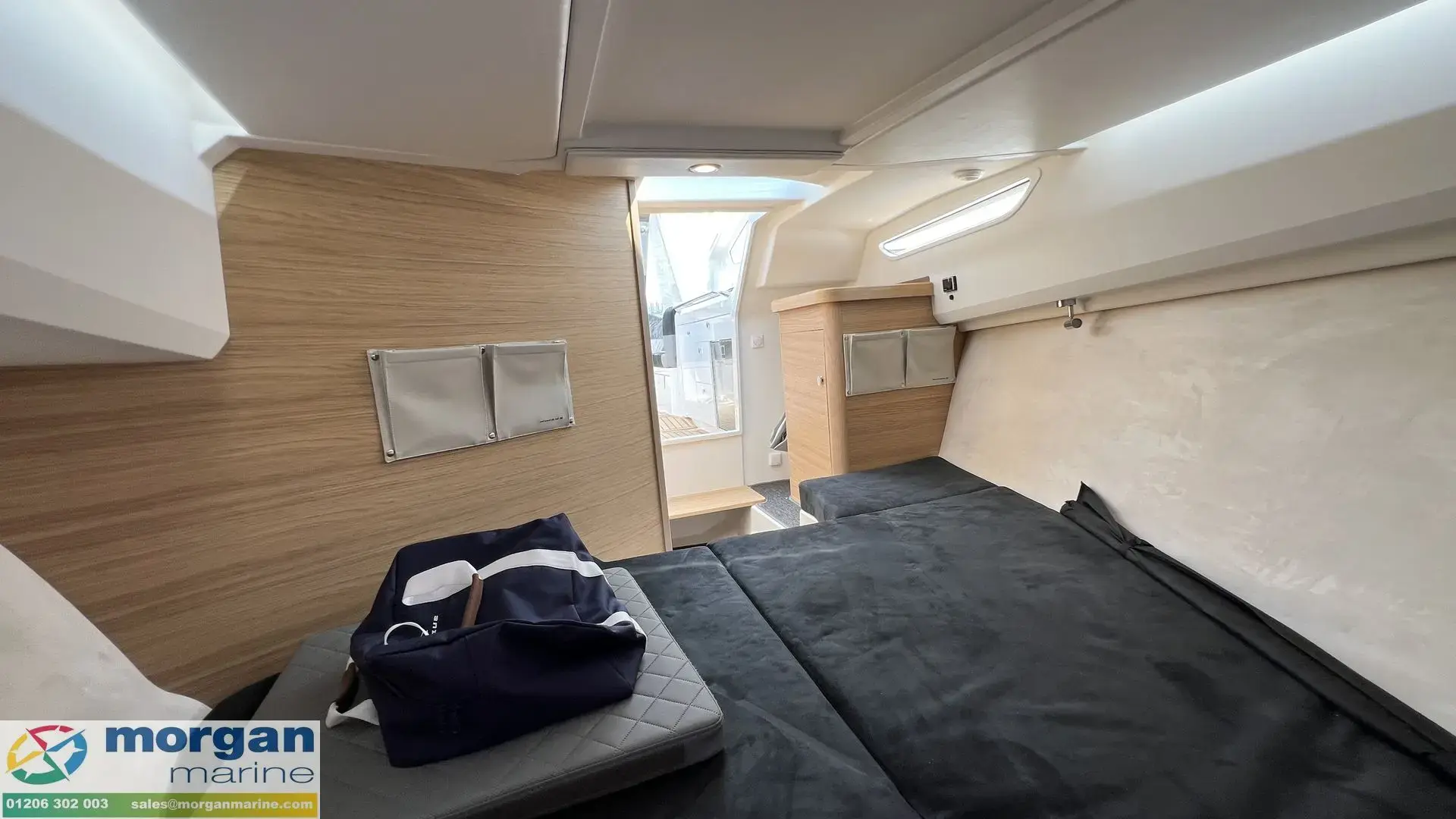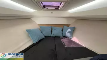The forward cabin features a cozy double berth and a dedicated wardrobe, as well as a separate toilet compartment equipped with an electric-flush head, sink, and shower - ensuring onboard convenience and privacy. To enhance onboard comfort, cabins are fitted with plush carpeting and curtains. Freshwater capacity of approximately 56 litres supports both the head and shower facilities. Includes Nimbus crockery & cutlery.