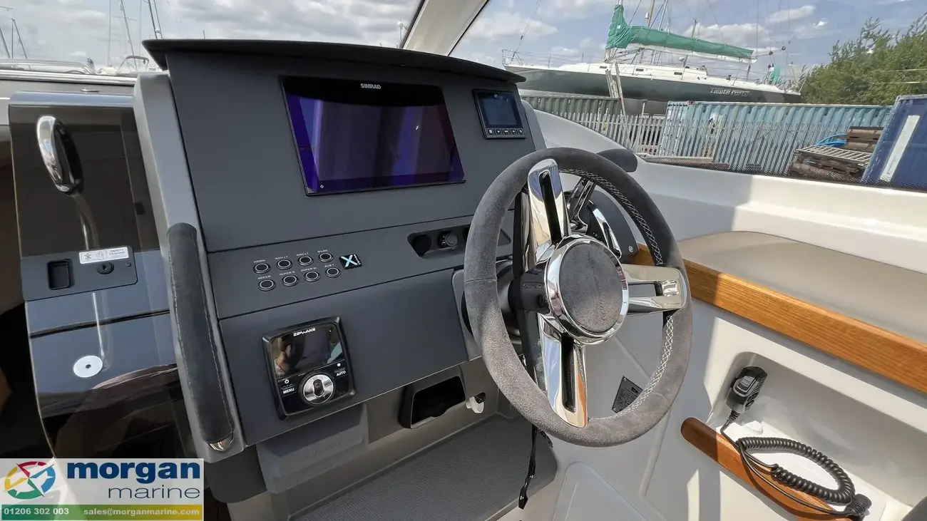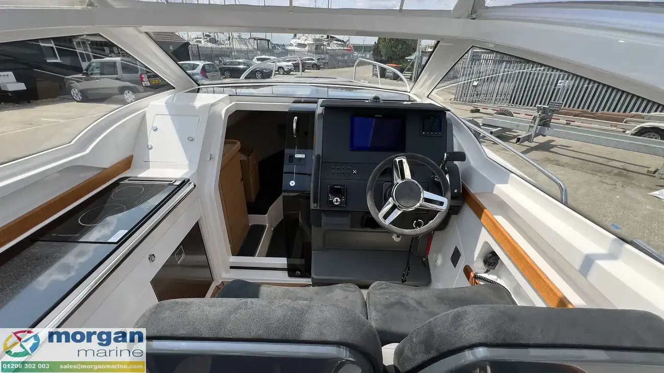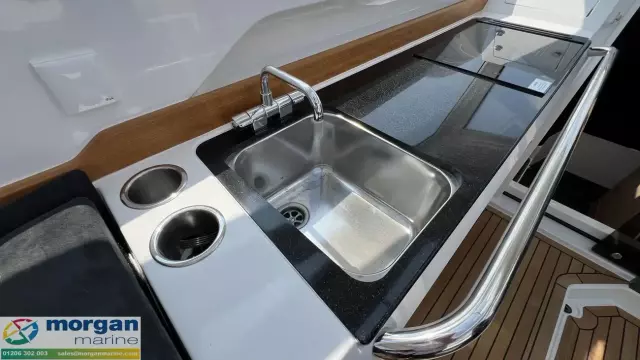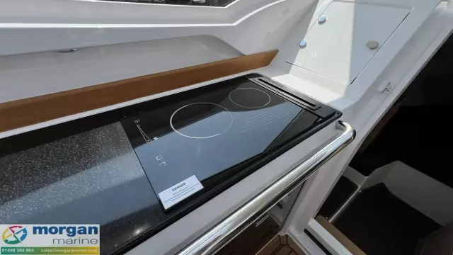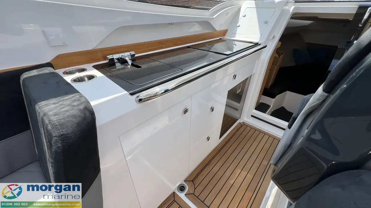 The spacious wheelhouse blends panoramic visibility with premium comfort. Laminated safety glass and a wide arched windscreen - complete with wiper, screen wash, and defroster - ensure excellent sightlines from both the helm and saloon. Inside, matte surface finishes help reduce glare and are simple to keep clean. Ergonomic helm seat, designed for both seated and standing positions. Port galley, which includes a sink, fridge and storage. The X‑Edition adds exclusive touches throughout the cockpit, including a custom steering wheel, handles, and dark grey suede upholstery with matching cockpit cushions - elevating both comfort and style.