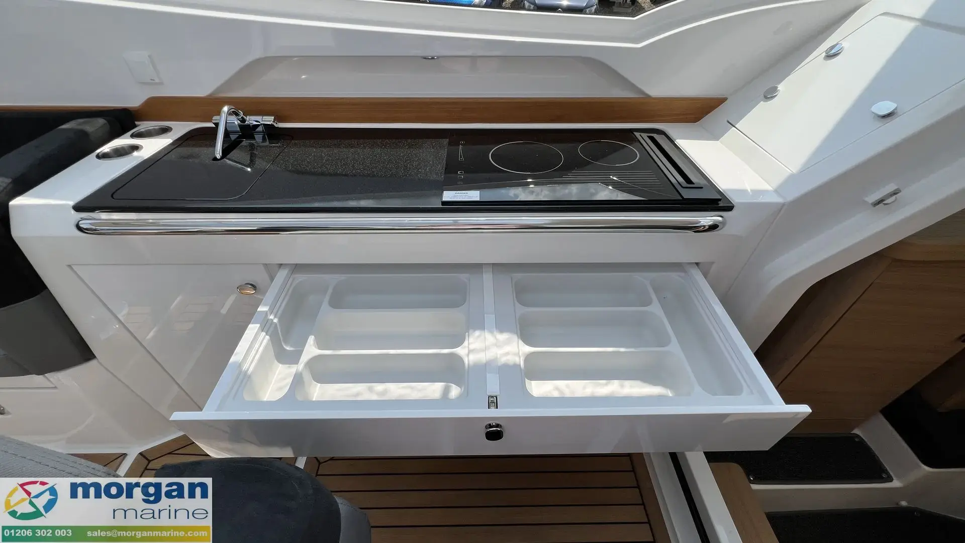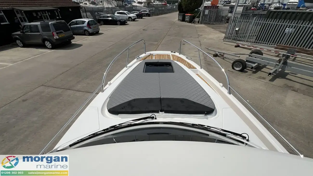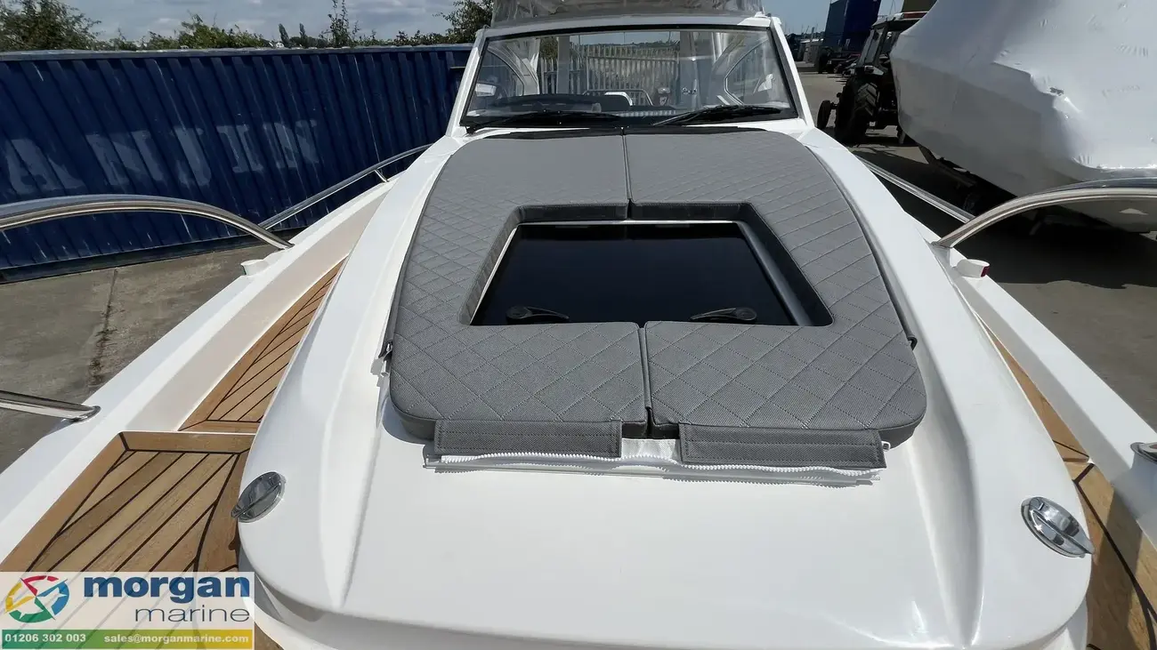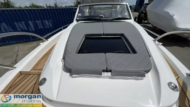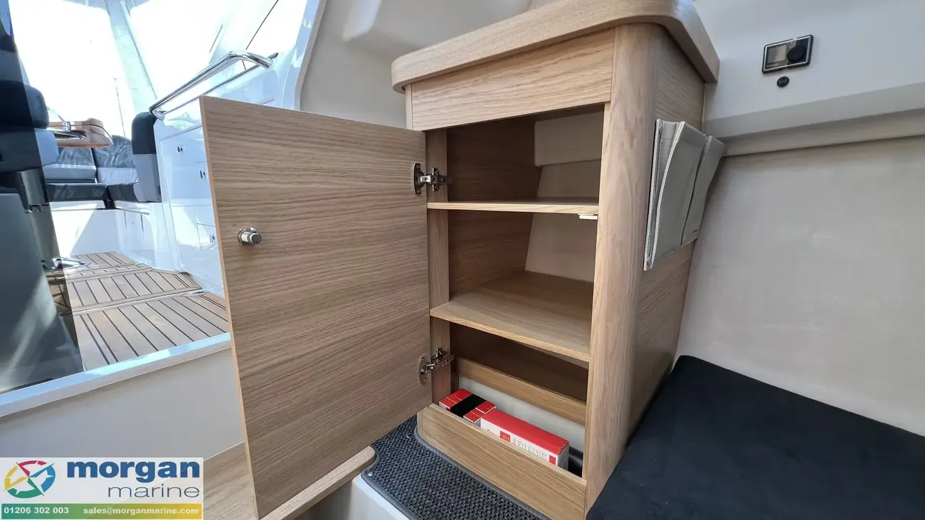 The spacious wheelhouse blends panoramic visibility with premium comfort. Laminated safety glass and a wide arched windscreen - complete with wiper, screen wash, and defroster - ensure excellent sightlines from both the helm and saloon. Inside, matte surface finishes help reduce glare and are simple to keep clean. Ergonomic helm seat, designed for both seated and standing positions. Port galley, which includes a sink, fridge and storage. The X‑Edition adds exclusive touches throughout the cockpit, including a custom steering wheel, handles, and dark grey suede upholstery with matching cockpit cushions - elevating both comfort and style.