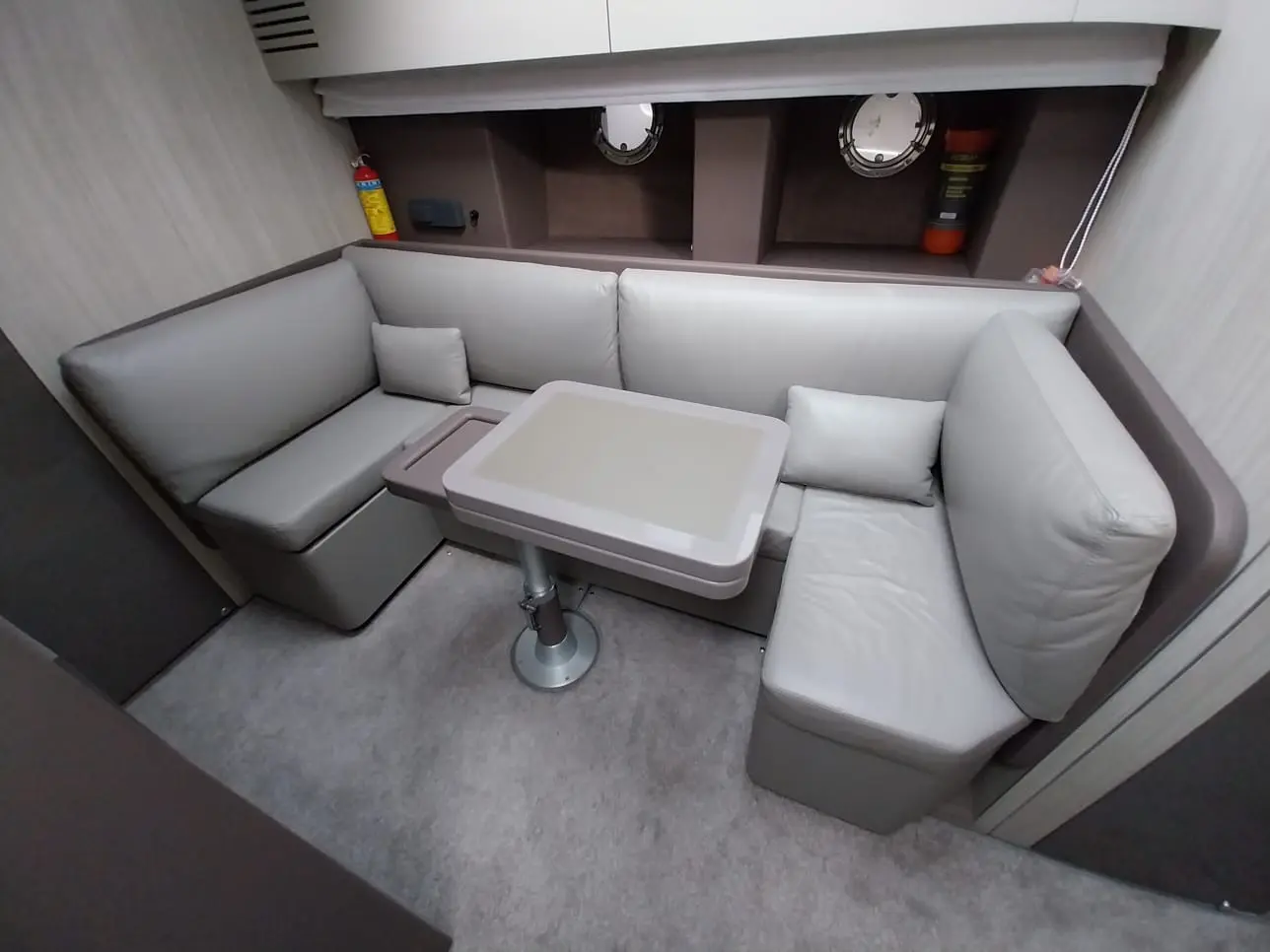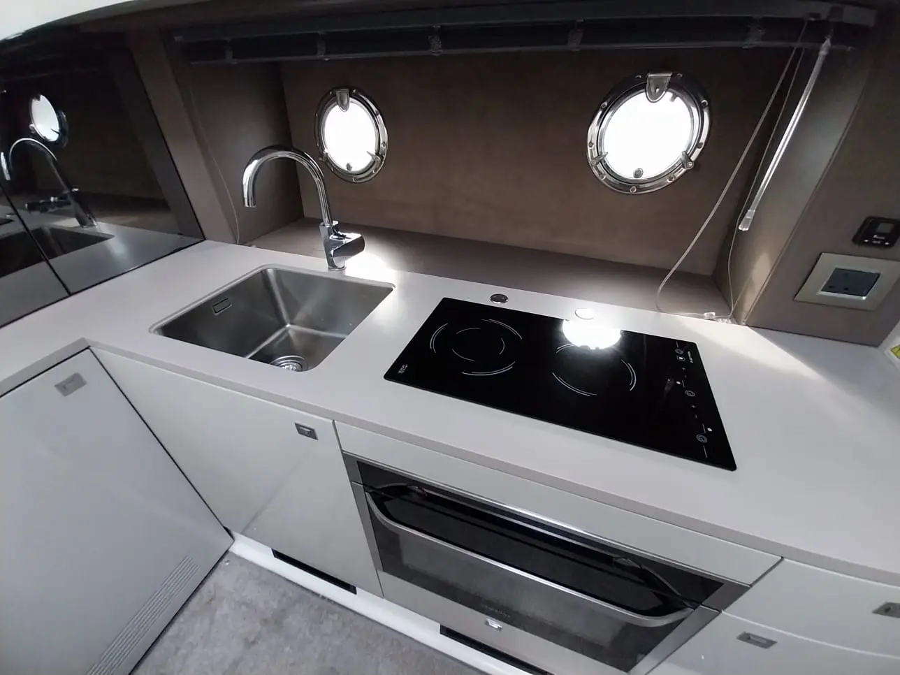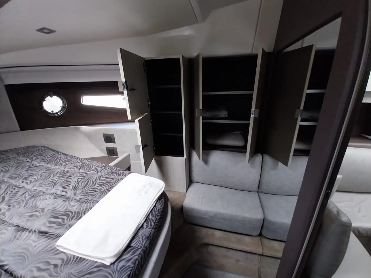 Water distribution system directly from the dock, Roll-up foldaway hose pipe, Grey water shower collection system, Acoustic and visual alarm on dashboard for water in the bilge, Shore power 32 amp shore cable, Ultramarine 16kg stainless steel anchor with 50m of 8mm chain and 800w electric winch, Electric control for stern garage opening with housing for 2m tender, Engine/onboard service batteries X3 with automatic battery charger 35amp, Electric boiler, Magnetic compass, Stern cabin 2 or 3 berth, Forward cabin double berth, Saloon table converts to a double berth, Electric toilet, Bathrooms & toilet curtains, Stern sunbathing cushions and covers, Bow sunbathing cushions with covers, Cockpit shower, 2 X automatic fire extinguishers in engine room and 2 manual cockpit & galley, Side opening window port & starboard, Combi microwave oven, Fridge 30l with freezer, Cooker top in glass ceramic 2 burner hob with pot catchers, Radio/cd/dvd in saloon with control in cockpit, Water pump, Cockpit hardtop with large electric opening roof, Forward stainless steel fender holders, Window screen wipers, Teak laid to cockpit & bathing platform, Electronic steering + single leaver controls + joystick cruise control + trip computer and power trim assistance , Mosquito nets. Waste water tank, Cabin heater diesel burner system, Anchor winch remote control with metre counter, 28" tv in saloon, VHF/DSC,
