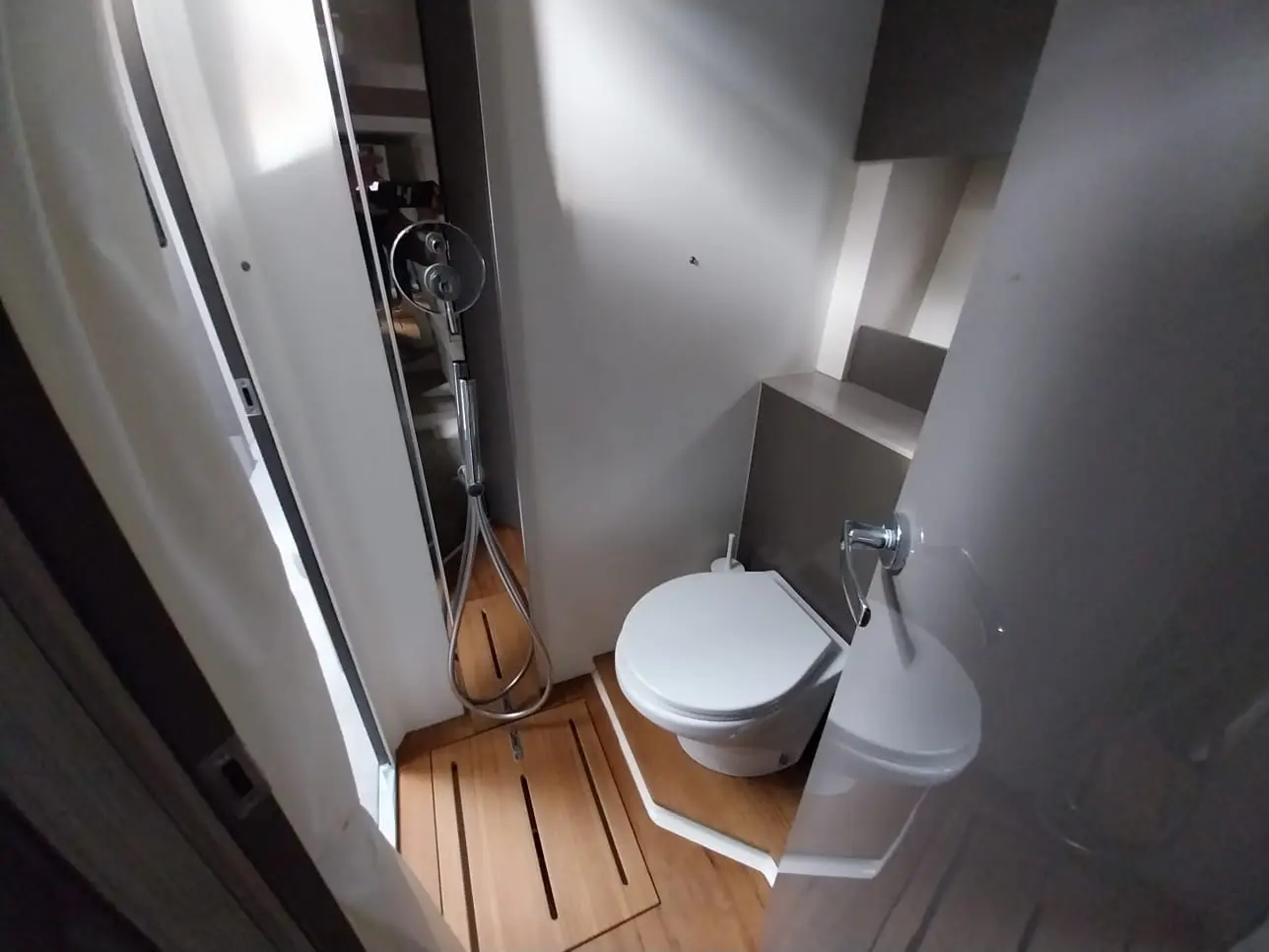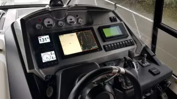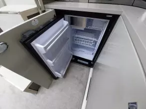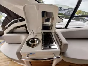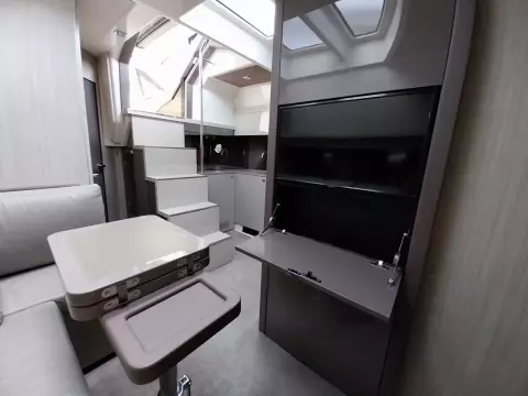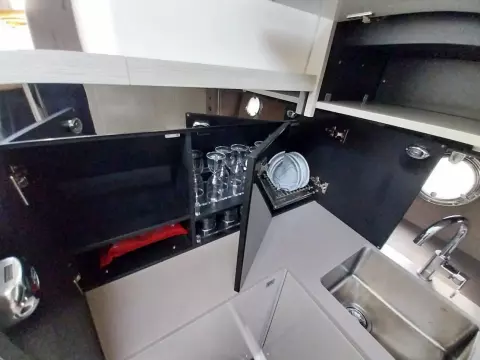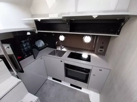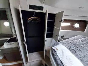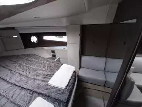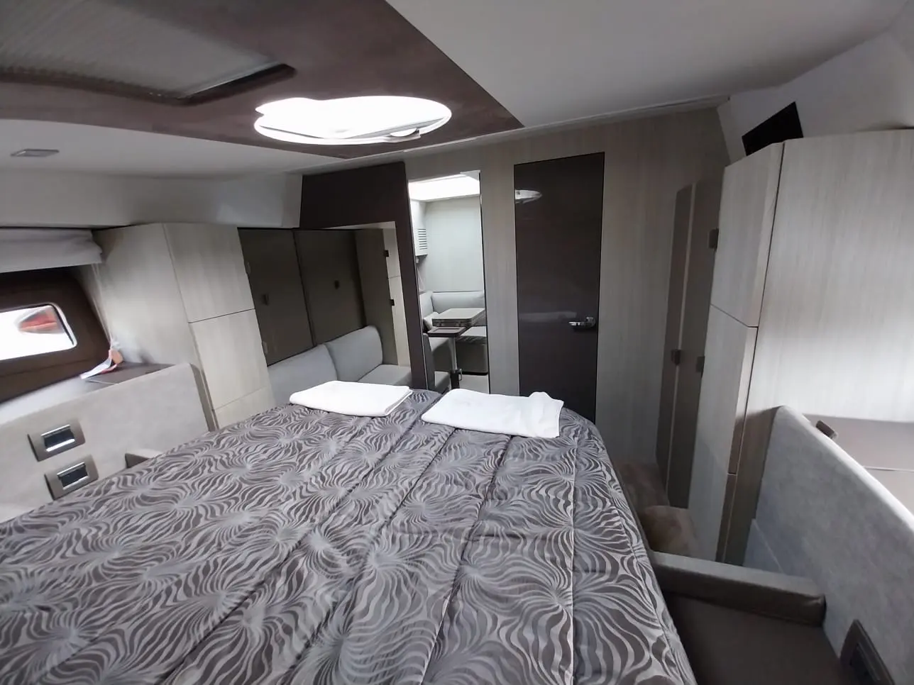 Water distribution system directly from the dock, Roll-up foldaway hose pipe, Grey water shower collection system, Acoustic and visual alarm on dashboard for water in the bilge, Shore power 32 amp shore cable, Ultramarine 16kg stainless steel anchor with 50m of 8mm chain and 800w electric winch, Electric control for stern garage opening with housing for 2m tender, Engine/onboard service batteries X3 with automatic battery charger 35amp, Electric boiler, Magnetic compass, Stern cabin 2 or 3 berth, Forward cabin double berth, Saloon table converts to a double berth, Electric toilet, Bathrooms & toilet curtains, Stern sunbathing cushions and covers, Bow sunbathing cushions with covers, Cockpit shower, 2 X automatic fire extinguishers in engine room and 2 manual cockpit & galley, Side opening window port & starboard, Combi microwave oven, Fridge 30l with freezer, Cooker top in glass ceramic 2 burner hob with pot catchers, Radio/cd/dvd in saloon with control in cockpit, Water pump, Cockpit hardtop with large electric opening roof, Forward stainless steel fender holders, Window screen wipers, Teak laid to cockpit & bathing platform, Electronic steering + single leaver controls + joystick cruise control + trip computer and power trim assistance , Mosquito nets. Waste water tank, Cabin heater diesel burner system, Anchor winch remote control with metre counter, 28" tv in saloon, VHF/DSC,