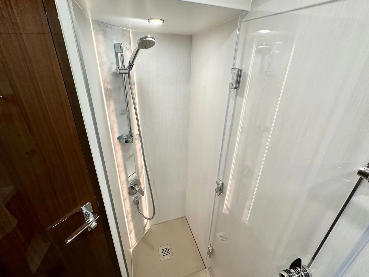 This example features the 2-cabin layout, providing a spacious and beautifully appointed master suite alongside a generous guest cabin, finished with Fairline’s renowned craftsmanship and attention to detail.