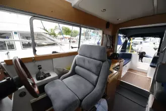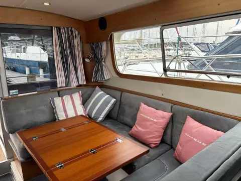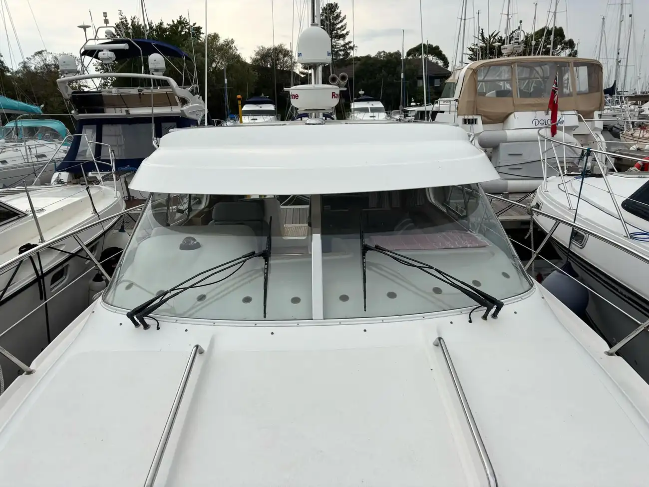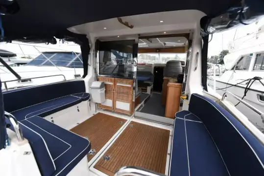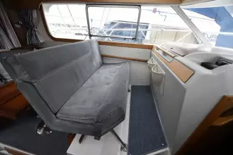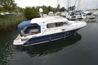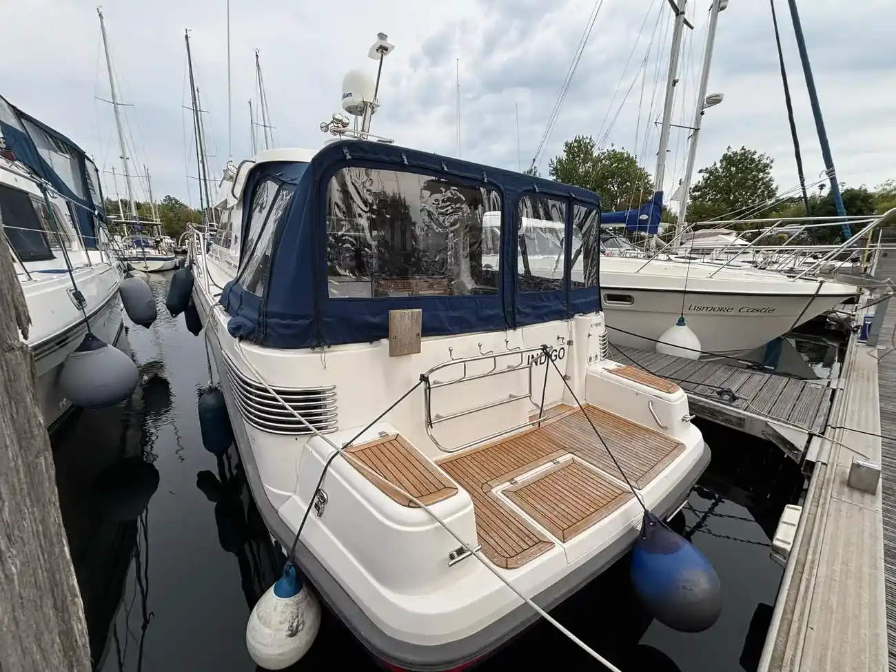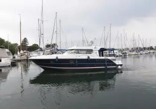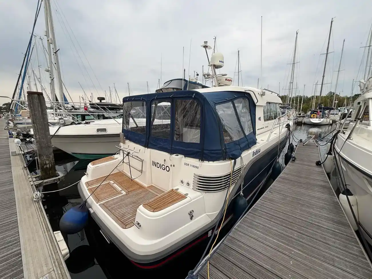 2005 Nimbus 350 Coupe with twin Volvo KAMD 43 inboard diesel engines on V-drives. A 2006 model, ‘Indigo’ is a fine example of this robustly built boat from Scandinavia. Spacious saloon with fabulous convertible double co-pilot seat for comfortable cruising when underway. Separate heads compartment with shower and electric toilet, and two comfortable double cabins with a range of storage lockers throughout. Easy manoeuvring with bow and stern thrusters. The inventory also includes hot water, heating and transom shower. Ideal couples cruiser with room for guests. Available to view by appointment in Chichester.