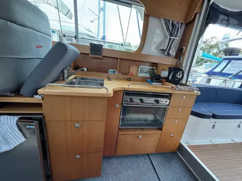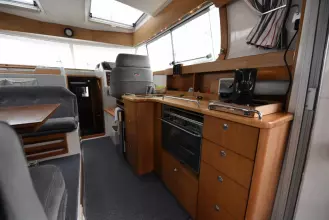 · Galley to starboard with 12v fridge with ice box, stainless steel sink, two burner hob, gas oven and grill, cutlery and crockery.