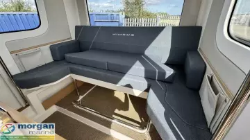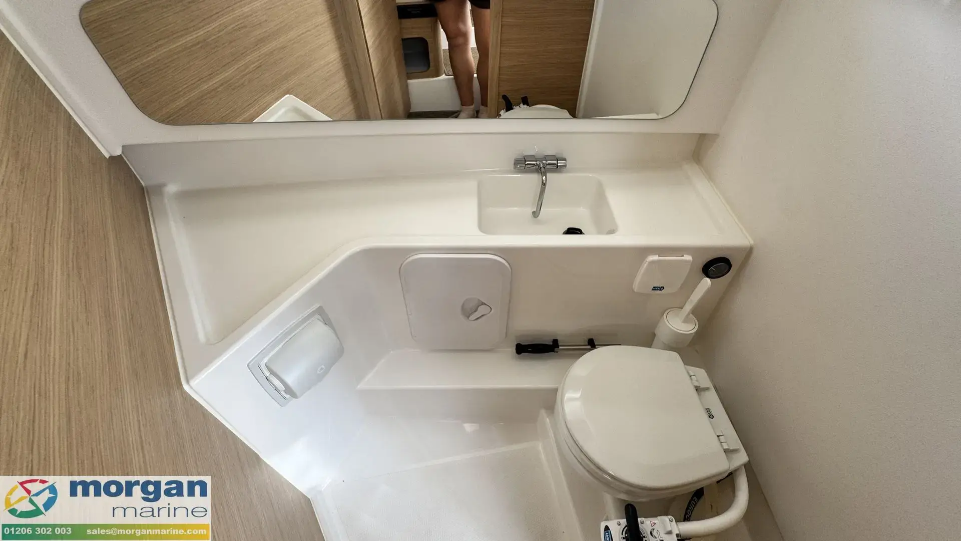 Inside, the forward cabin is finished in Nordic oak with double berth cushions and beige carpets. The port side galley includes hot water and an LPG gas cooktop, providing practicality for onboard meals, along with a Nimbus cutlery and crockery set. There is a separate toilet compartment on the starboard side. Extra portlights brighten the cabin space. In the saloon, the sofa converts to an additional berth for both comfort and flexibility. The Nimbus pillow set completes a warm, welcoming interior. Additional convenience comes from black-water overboard discharge.