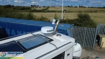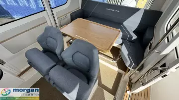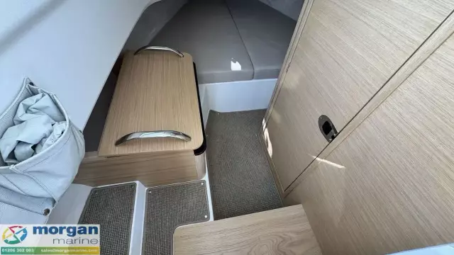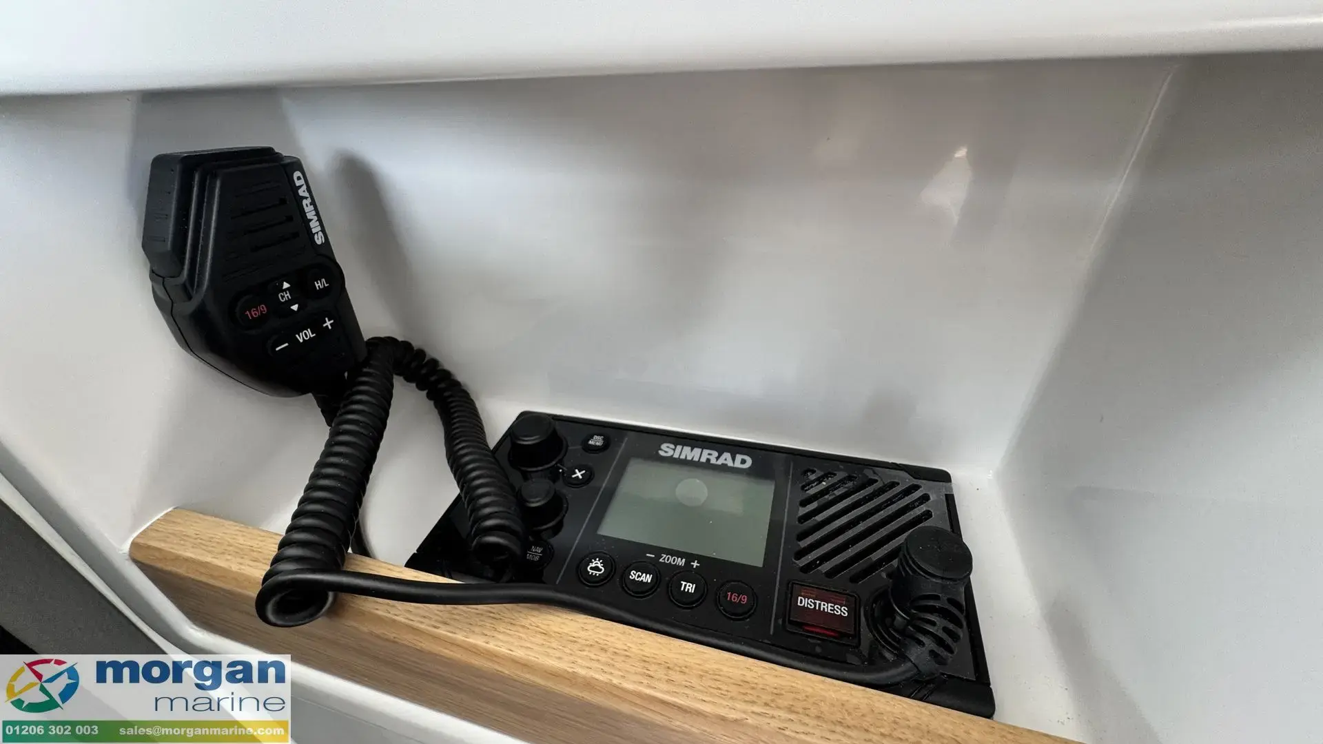 At the helm, 2x Simrad NSX 12” plotters deliver crystal-clear navigation, supported by a Simrad xSonic sonar – Bronze HDI XDCR, Hybrid Dual Imaging thru-hull transducer for accurate depth and seabed readings. The electronics suite includes a Simrad autopilot with OP12 controller, HALO20+ radar, and Precision 9 compass for radar overlay/autopilot. A Simrad RS40 VHF with AIS receiver and antenna is also included. The hifi package features a Clarion CMM30 stereo and 2x CMS651 speakers in the cockpit. The helm layout is clean and ergonomic, providing essential information and controls at your fingertips. Onboard power and electronics are supported by the engine system and include the full Simrad suite for navigation, sonar, and communication. Additional features include an Isotherm 15L hot water system, Chargemaster shore power 12/25a, 25m cable, 2x 230v outlets, 2x underwater lights (blue), a search light on a stainless steel mast with joystick, a wireless charging nest for phones, and a remote control for the bow thruster and windlass.