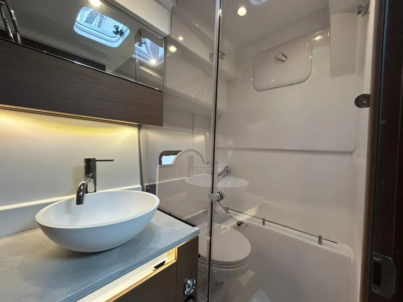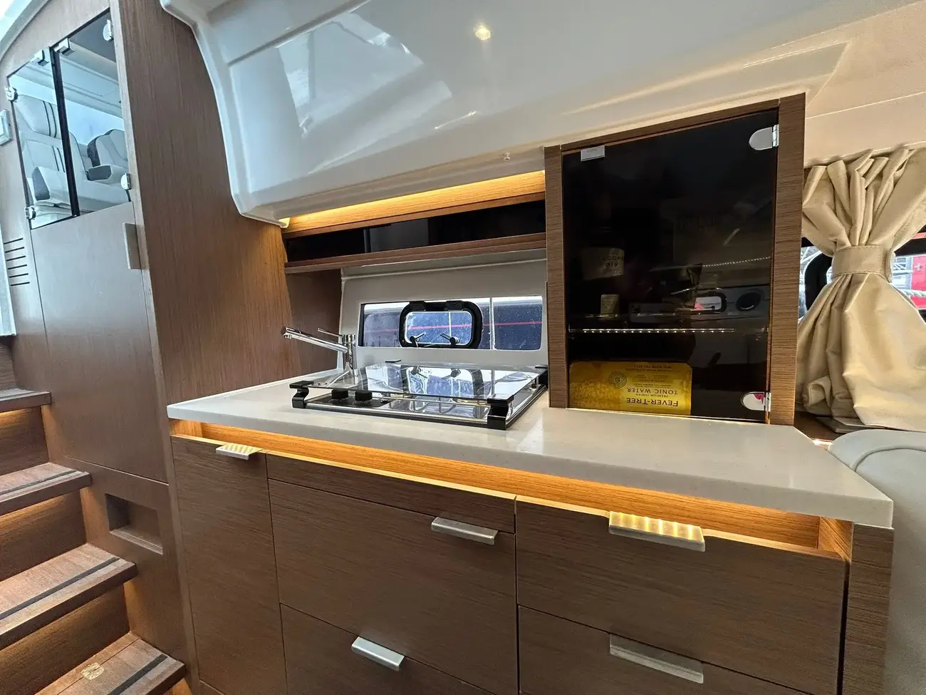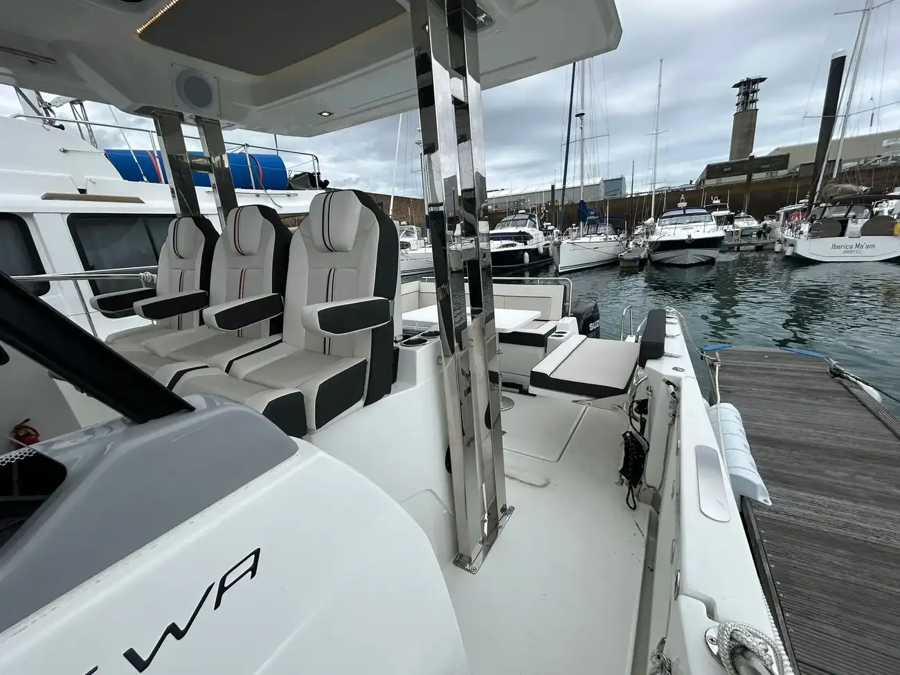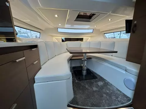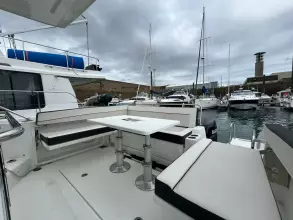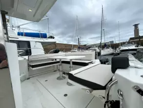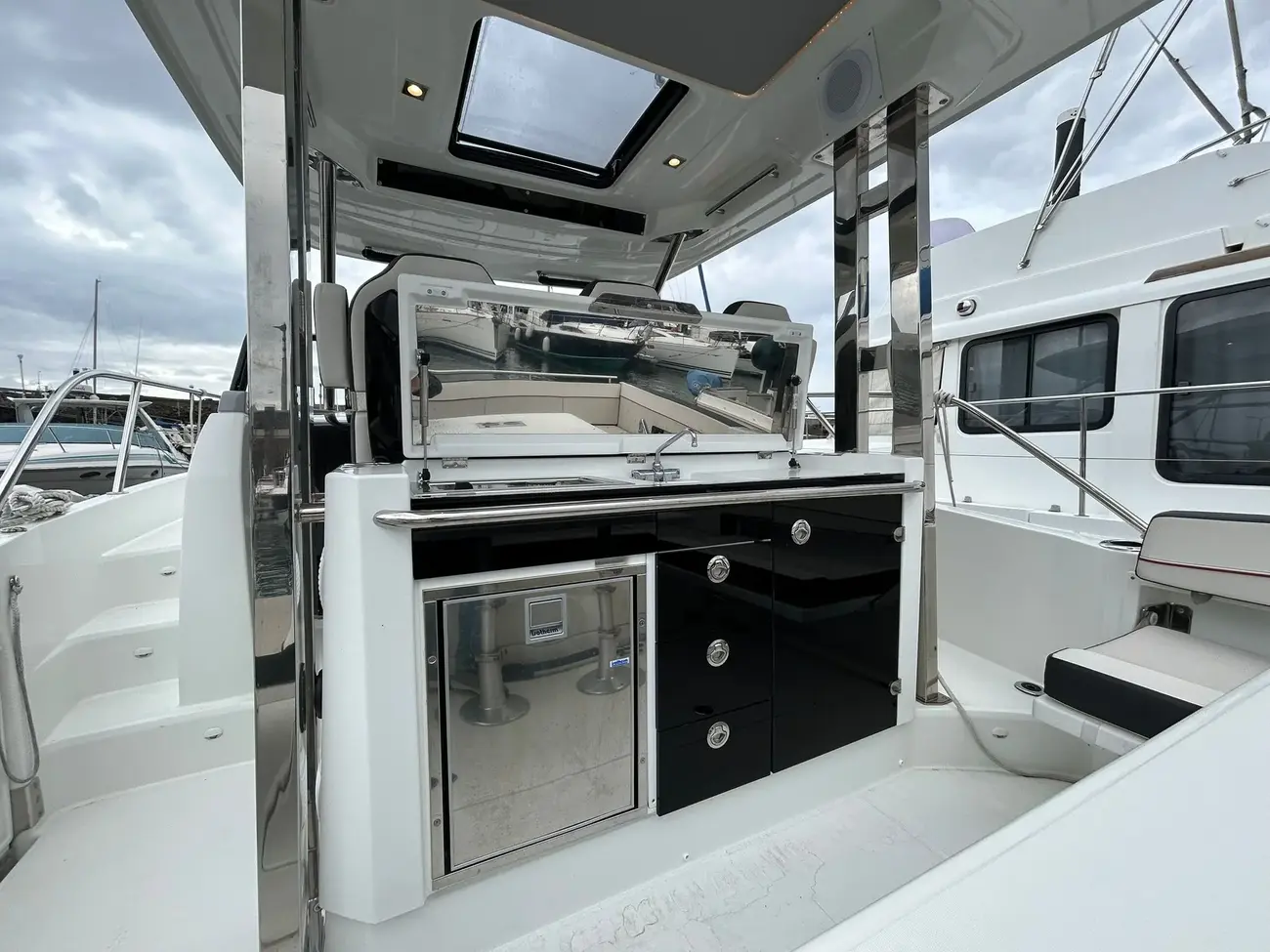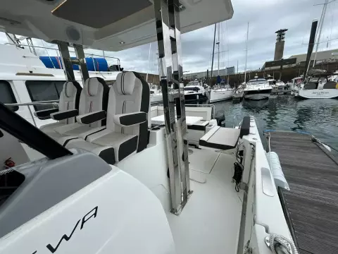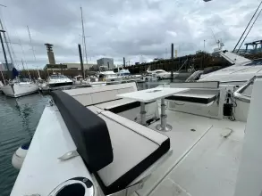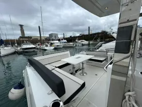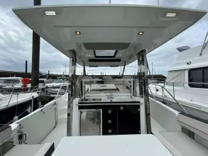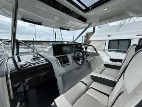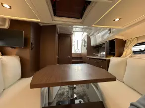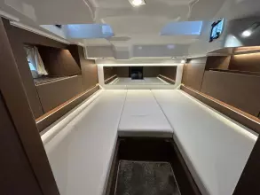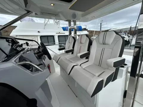 - Aft cockpit saloon: Gather around a generous wraparound bench and large dining table beside a beautifully appointed outdoor galley. A side terrace opens directly to the sea, creating even more space to enjoy the water—along with the expansive aft swim platforms.