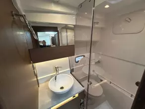 Flooded with natural light from large hull windows, the interior offers two separate sleeping areas for up to four guests, each ensuring complete privacy. You’ll also find a fully equipped galley and a head compartment with a separate shower—perfect for comfortable family getaways.