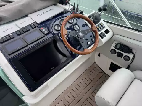 This Fairline Targa 40 was fully refitted in 2024 by Knight Marine, including new electronics, all new LED lighting, new fridges, new batteries, new upholstery, new canopy, new carpets and curtains, and extensive engine and outdrive updates.  She is a stylish and extremely spacious 6-berth sports cruiser that perfectly blends performance, comfort, and luxury as well as providing amazing sea keeping abilities. Powered by twin Volvo Penta KAD 44 (260hp) diesel engines—both fully serviced in 2024 with rebuilt drives, replaced belts and idlers,  new starter motor, new alternators, new water pumps and replacement fuel hoses —she is ready for effortless cruising. Featuring a sleek dark blue hull and wrap-around windscreen, the boat boasts a large and versatile cockpit area with an L-shaped settee, helm seat, and U-shaped aft dining area. There's also a wet bar with a built-in BBQ, a generous sun pad, and a tender garage with an electric winch for added convenience. Down below, the interior offers impressive 6’6” headroom, high-gloss cherry cabinetry, a spacious saloon, and two separate cabins, all finished to a high standard with new upholstery, curtains and carpets throughout. The boat is also equipped with a new bow thruster, fully serviced stern thruster, complete suite of new Garmin electronics, including 12” chart plotter, VHF, autopilot, Fusion stereo system and radar.  The boat also has a Mastervolt 3000 combi charger / inverter for offgrid power. Currently lying in Southampton and ready for viewings, she represents an exceptional opportunity to own a refitted classic with timeless appeal.