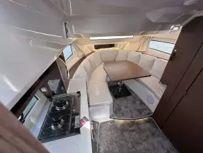 Upholstered in the upgraded white gold fabric with Walnut wood finish. The light and spacious forward cabin has light from the large sea vision hull windows, forward facing window, and opening deck hatches. This table can also be converted into a double berth, and there is also a concealed curtain that can be drawn to provide some additional privacy.