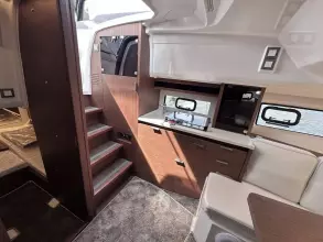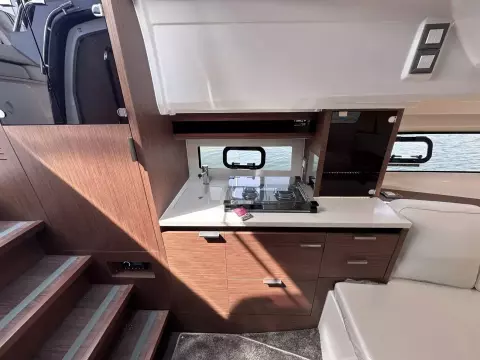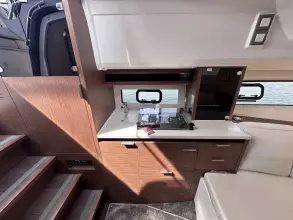 The galley on the port-side houses a sink, fridge, microwave, and various storage compartments.