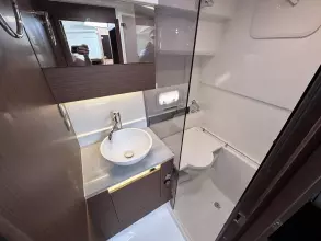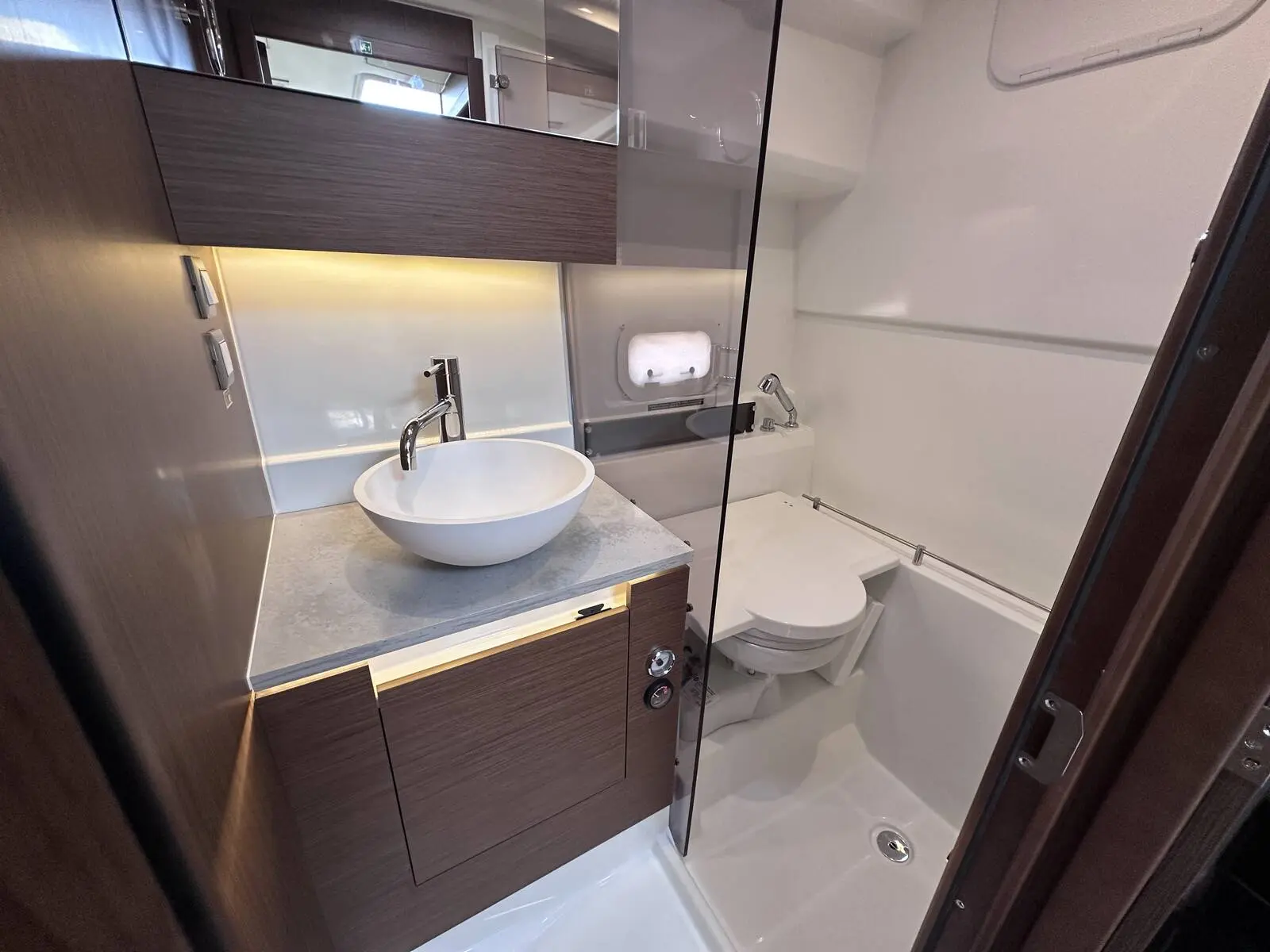 On the starboard side, there is a generous heads compartment that has a sink, marina fresh water electronic flush head, and several shower compartments with shower screen enclosure.