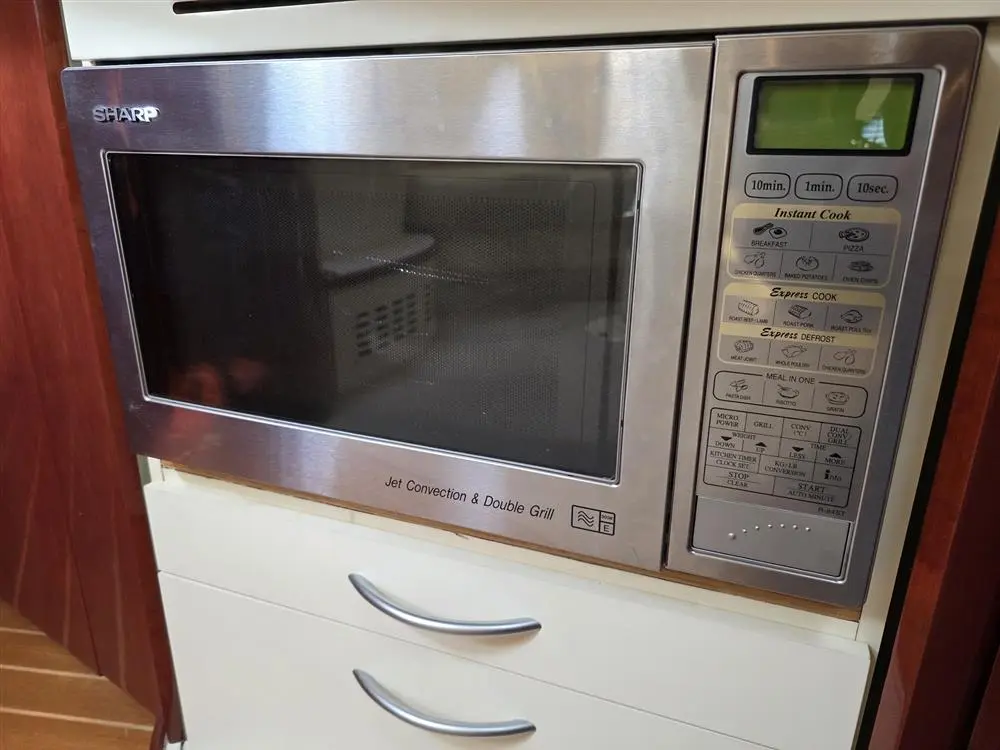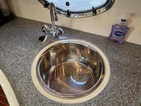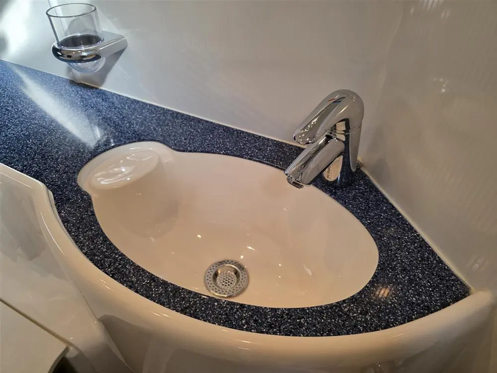 • Galley: Fully equipped with Corian worktops, a 2-burner hob, microwave, fridge, stainless steel sink with hot and cold water, and ample storage.