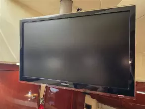 • Saloon: A large U-shaped seating area with a table, which converts into an additional double berth, offering flexible sleeping arrangements for guests. Samsung Smart TV mounted on a ceiling bracket.