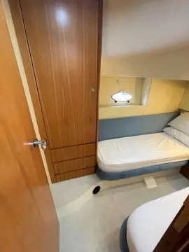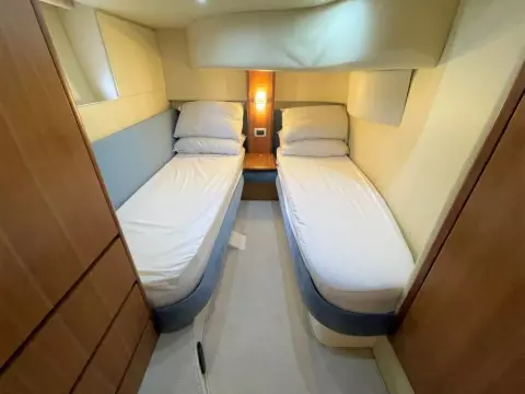 Guest starboard cabin has twin berths with good storage under berths, wardrobe, mirror and en-suite access to the day head.