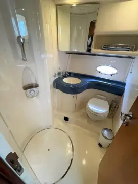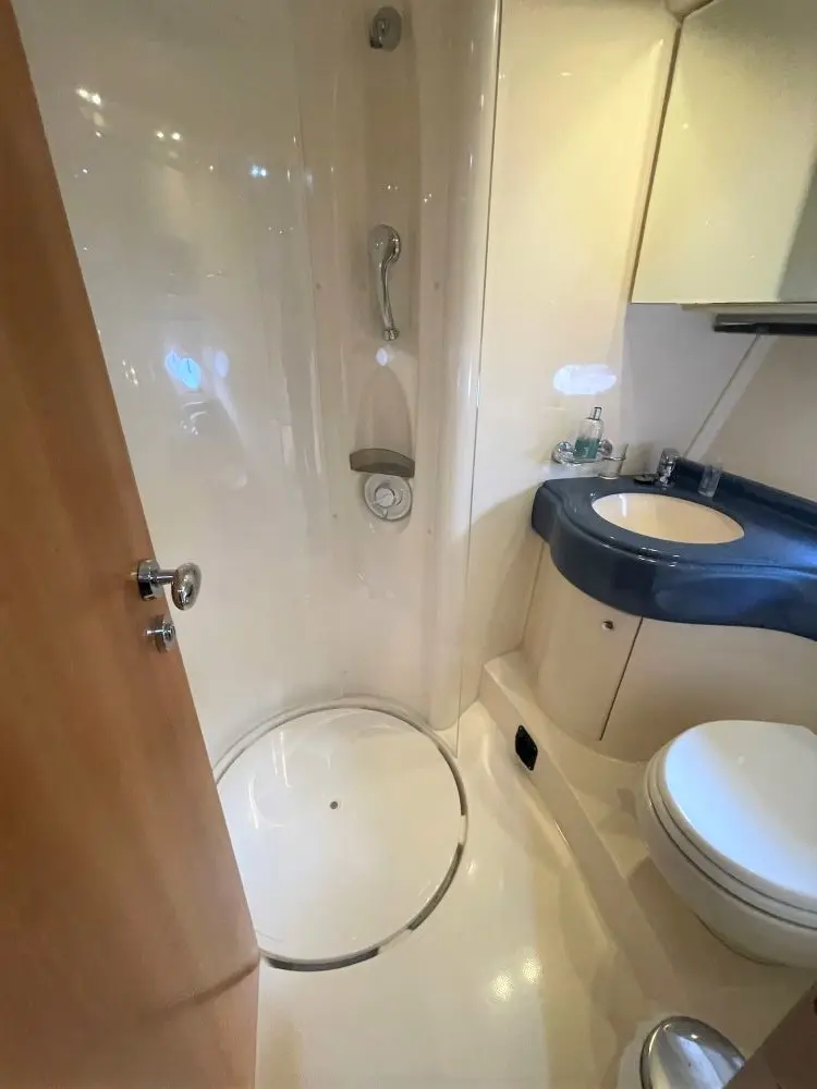 Day head to starboard with vacu flush sea toilet, sink, storage and classic screened shower.
