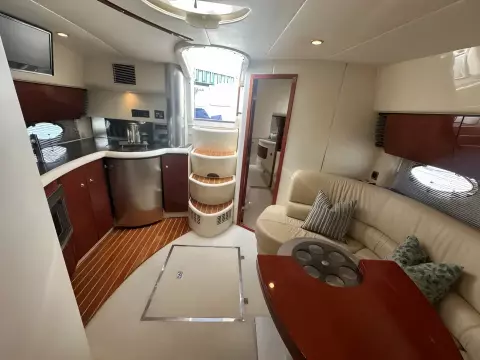 Spacious saloon/dinette to port upholstered in cream leather which converts to double berth as and when required