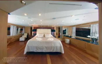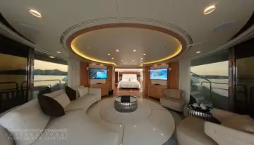 - 2 Large MASTER Cabins: Impressive MASTER suite on MAIN DECK with panoramic windows, private terrace with sitting & sunbathing areas, 2 bathrooms, Ultra-King bed & separate OFFICE which can also be used as a common area.