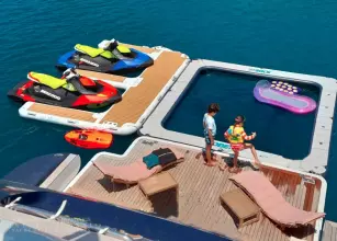 - Benetti Vision 145 when at anchor the garage transforms to a stunning BEACH CLUB with a sauna, a shower, gym equipment and an Ultra-Large SWIMMING PLATFORM (opening – 14 sq. meters).