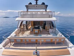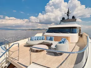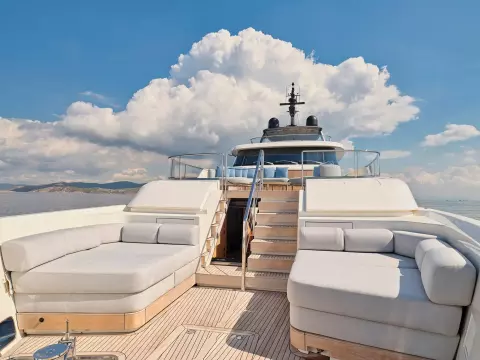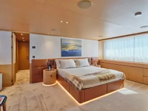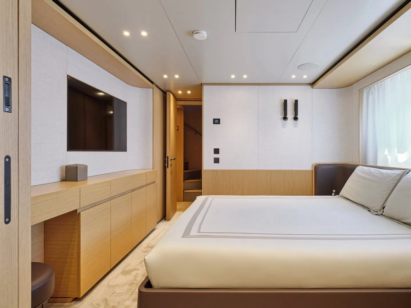 Accommodating 11 guests in five luxurious ensuite cabins, she offers refined interiors and standout features such as openable side balconies at the Beach Club — transforming life on the water into an unforgettable all-day experience. Powered by twin CAT C32 ACERT diesel engines of 1,622 hp each, she cruises comfortably at 14 knots, reaches a top speed of 19 knots, and boasts an impressive range of 2,500 nautical miles at an economical speed of 11 knots.