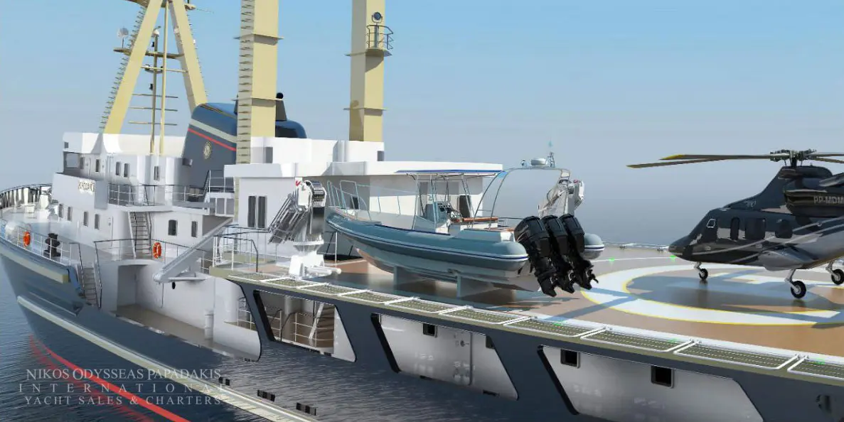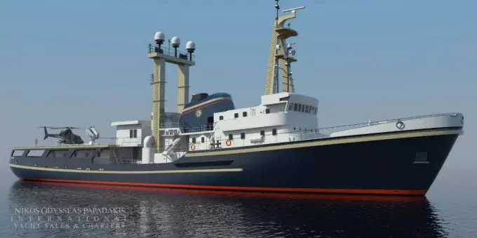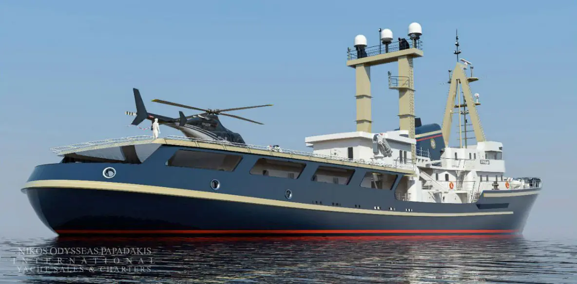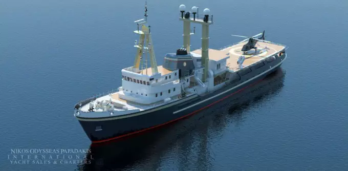 This powerful 77.40-meter expedition vessel is available for sale, either “as is” or fully finished according to the current refit plans/proposals (with delivery in 18 months).