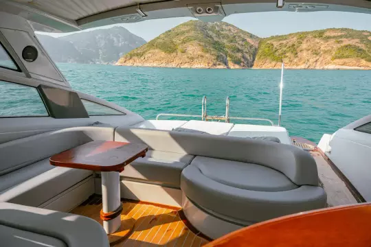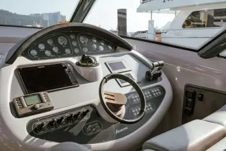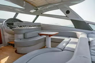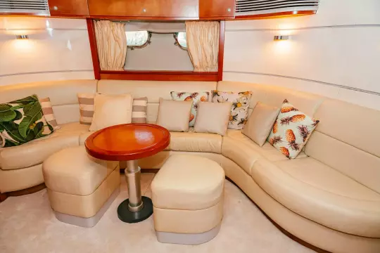 This Baiasaloon is huge and luxurious, with tall headroom and a plush, L-shape, leather settee to starboard.