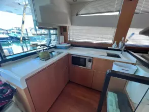 This remarkable vessel features three well-appointed cabins and two bathrooms on the lower deck, including a generously sized master cabin that offers a touch of opulence. The main deck showcases a large saloon, perfect for relaxation and entertaining, alongside a fully equipped galley that caters to all your culinary needs. The helm station is outfitted with advanced Garmin equipment, including GPS, chart-plotter, VHF radio, and bow thruster controls, ensuring ease of navigation and maneuverability.