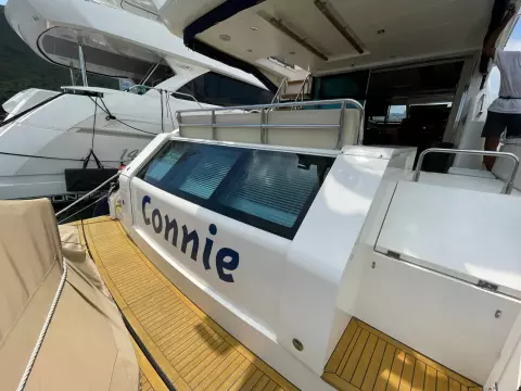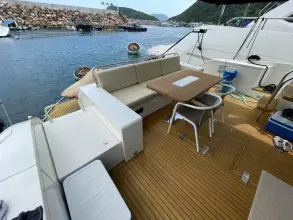 This Fairline Squadron 65 is a luxurious and stylish flybridge cruiser. It is evident that this yacht has been meticulously maintained and updated with no expense spared. The expansive teak-laid flybridge with upper helm provides ample space and is equipped with settees, sun pads, a large table with seating, and a wet bar. The teak-laid cockpit, featuring a gate to the hydraulic bathing platform, includes a large seat lounger and a teak table. The foredeck, complete with a sunshade and dedicated sun pads, is the perfect spot to enjoy the sun. Powering this vessel are twin 1135hp Caterpillar C18 diesel engines with only 850 engine hours.