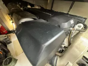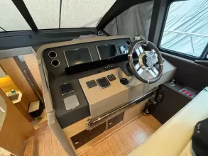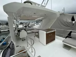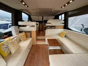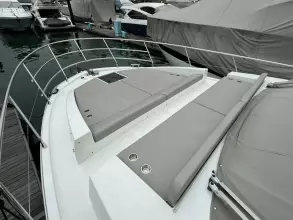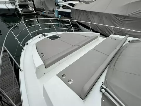 The spacious cockpit is protected by a large flying bridge, covering approximately 200 square feet, and is complemented by a generous foredeck seating area with a separate sofa and sunbed. An optional crew cabin can be installed beneath the cockpit sofa, providing an excellent berth despite limited headroom. The hydraulic platform can accommodate tenders up to 10 feet 6 inches long and weighing up to 770 pounds.
