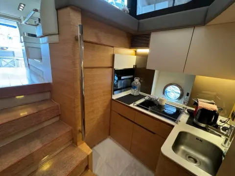 By placing the galley on the lower deck, a comfortable raised dinette is created opposite the helm, offering excellent views. The main-deck windows, while not as massive as they appear from the outside, consist of several panels with sturdy fiberglass supports, creating a bright and inviting deck saloon with discrete seating areas and a sofa-bed option on the starboard side. The interior design by Carlo Galeazzi features contrasting tones and textures, though additional handholds and fiddles for tables and galley surfaces would be beneficial.