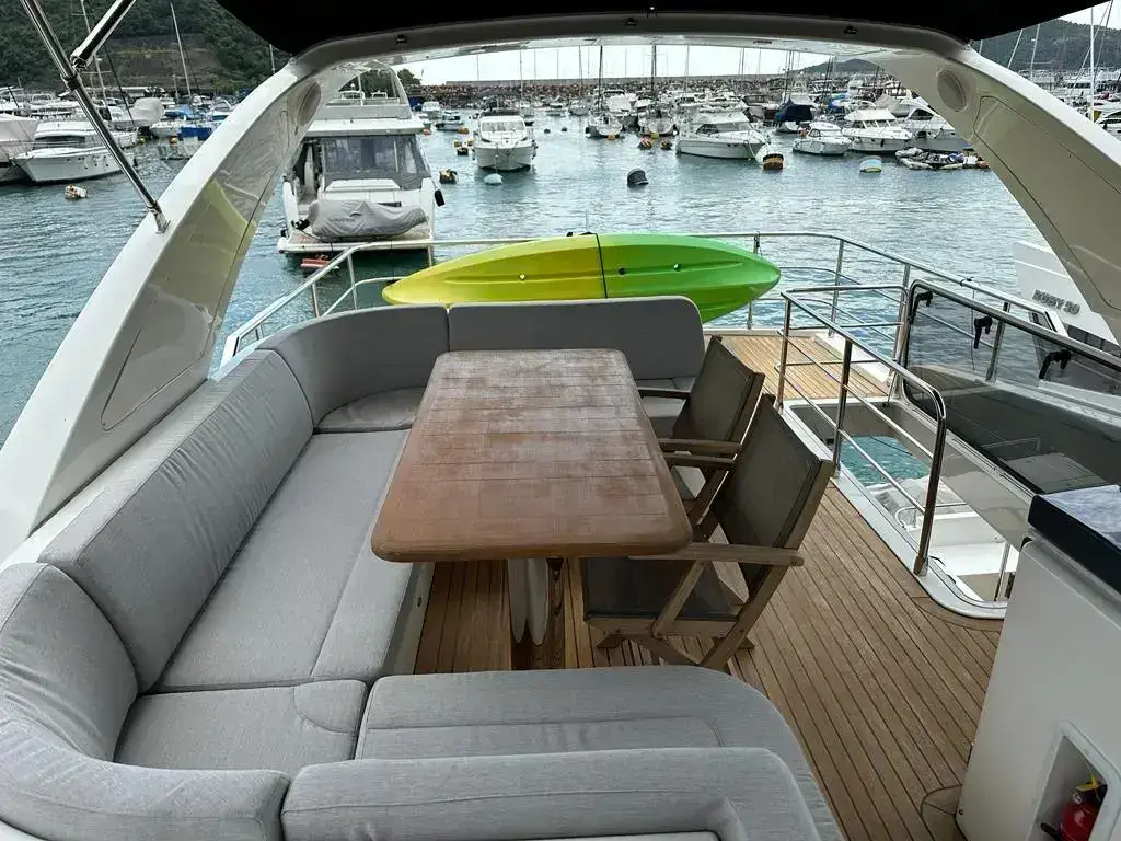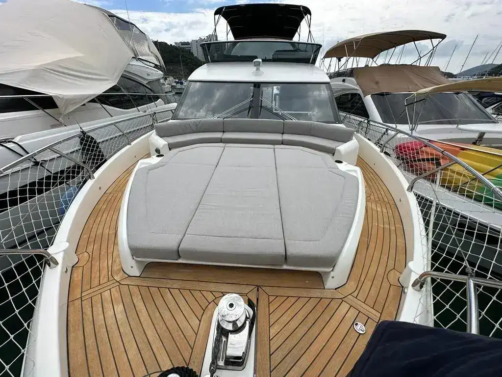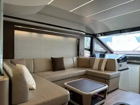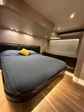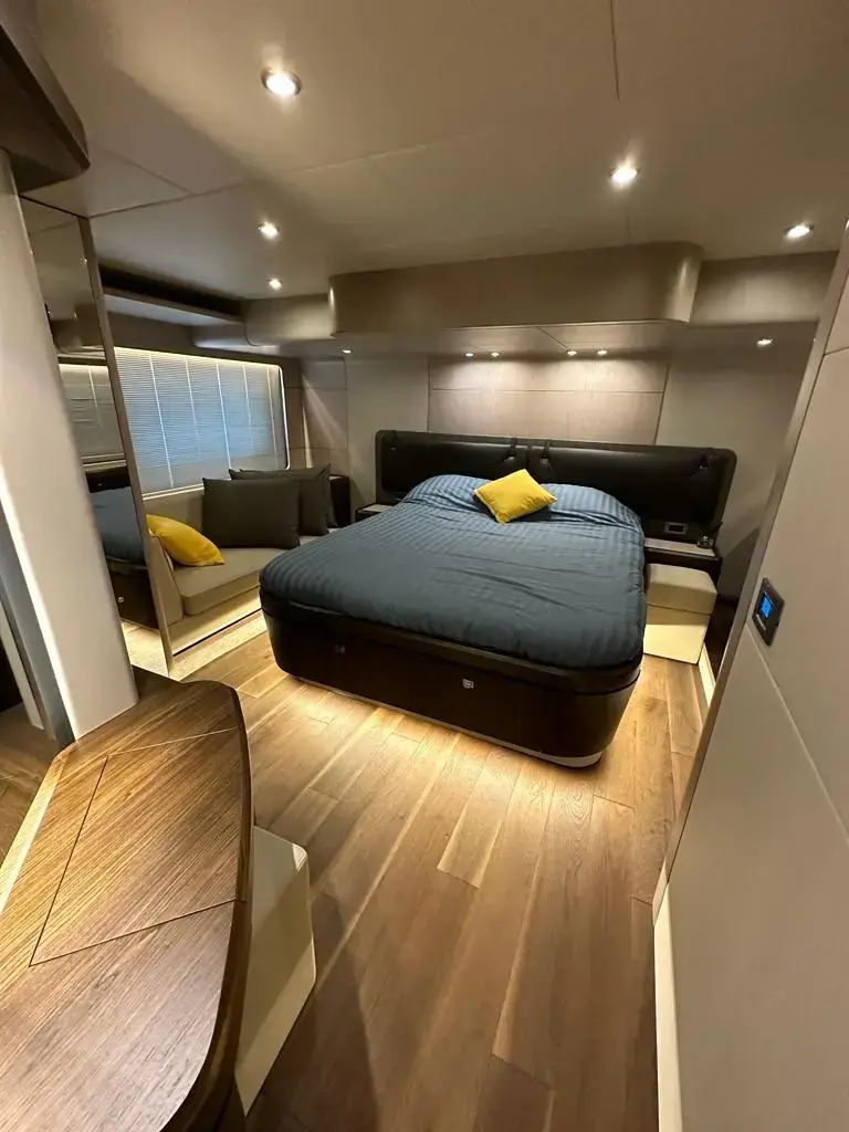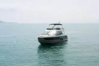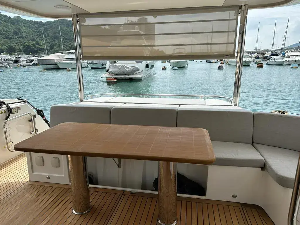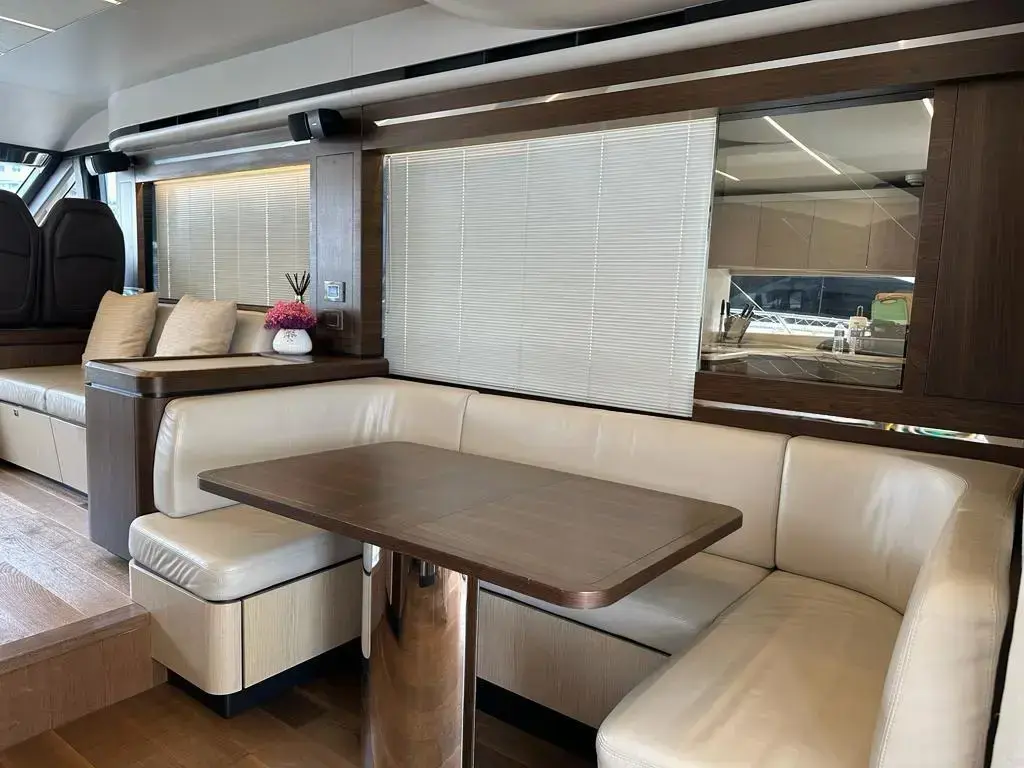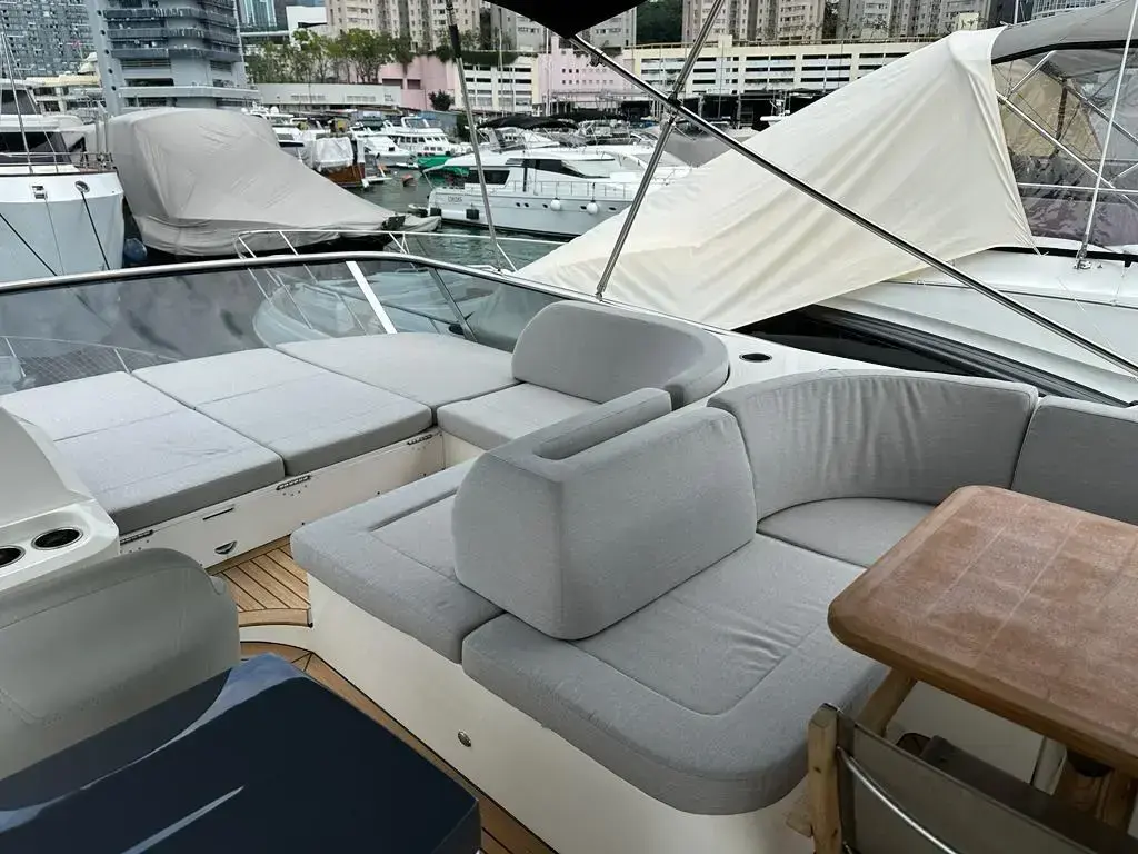 • Pearl grey-colour coverings for the cockpit, seats, wet bar and table on flybridge and sundae in the bow dinette